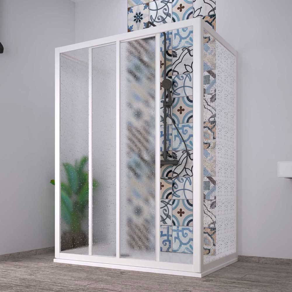 Profilo in PVC Bianco Pastello. Pannello in Acrilico, spessore 1,8 mm, effetto "Guazza". Reversibile Apertura Scorrevole laterale. Riducibilità dei binari di scorrimento attraverso l'ausilio di un seghetto. Importante, l'apertura si riduce in caso di riducibilità.