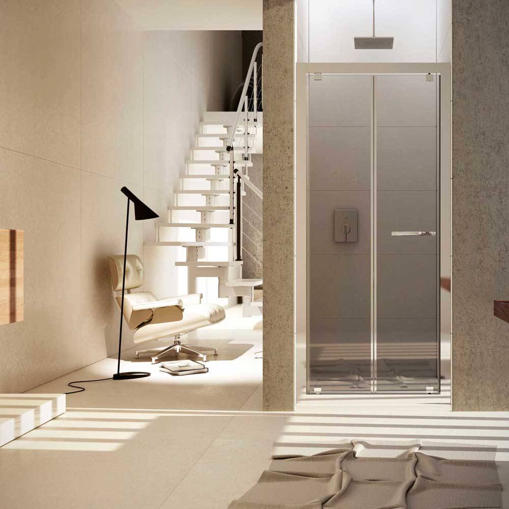 Profilo in Alluminio Cromato. Pannello in Cristallo, spessore 6 mm, Stampato C. Reversibile. Scorrimento su cuscinetti a sfera. Apertura a Soffietto versatile interna ed esterna.