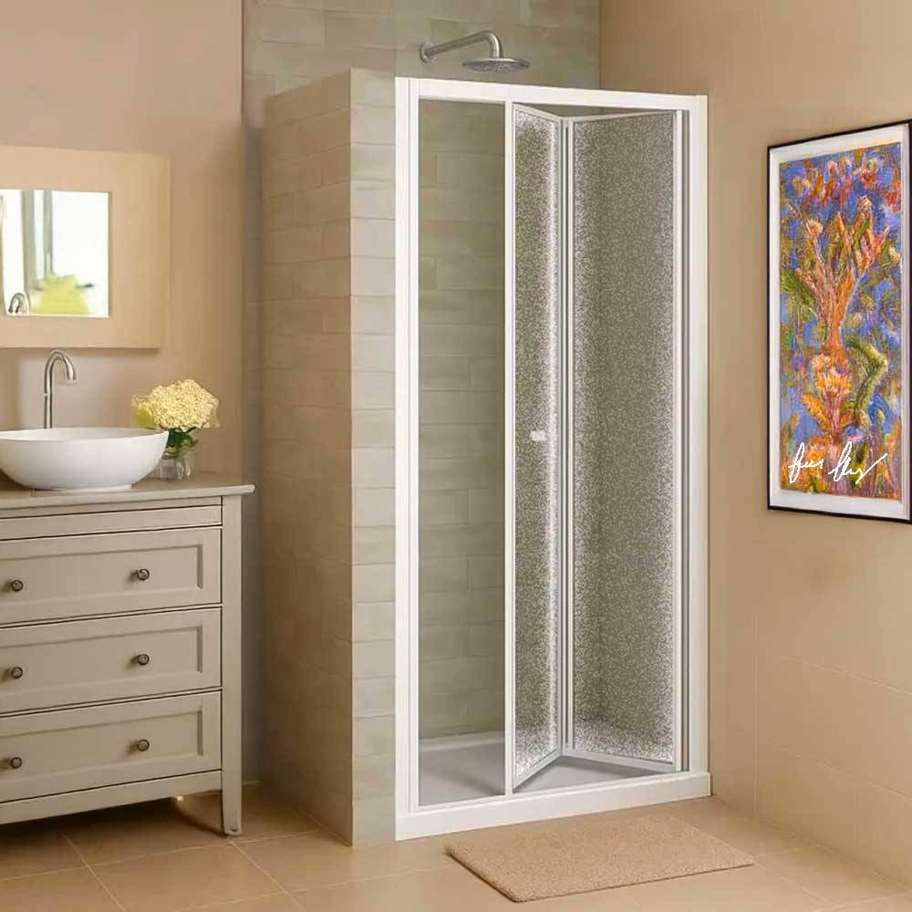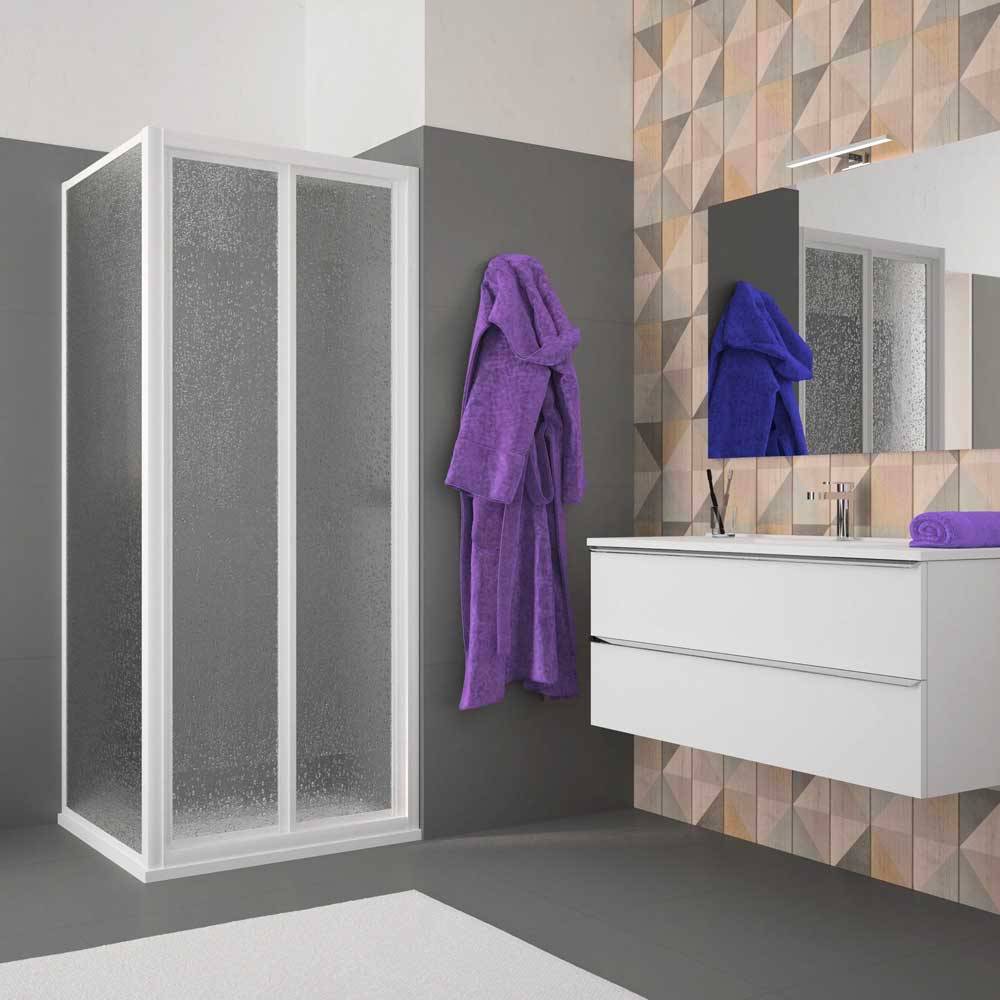 Cabina doccia reversibile, con apertura a scelta se Destra o Sinistra. Scorrimento lato superiore su Cuscinetti. Scorrimento lato inferiore su appositi ganci (18002). Struttura pesante in alluminio Bianco. Finitura Pannello: Bollicine Acrilico.