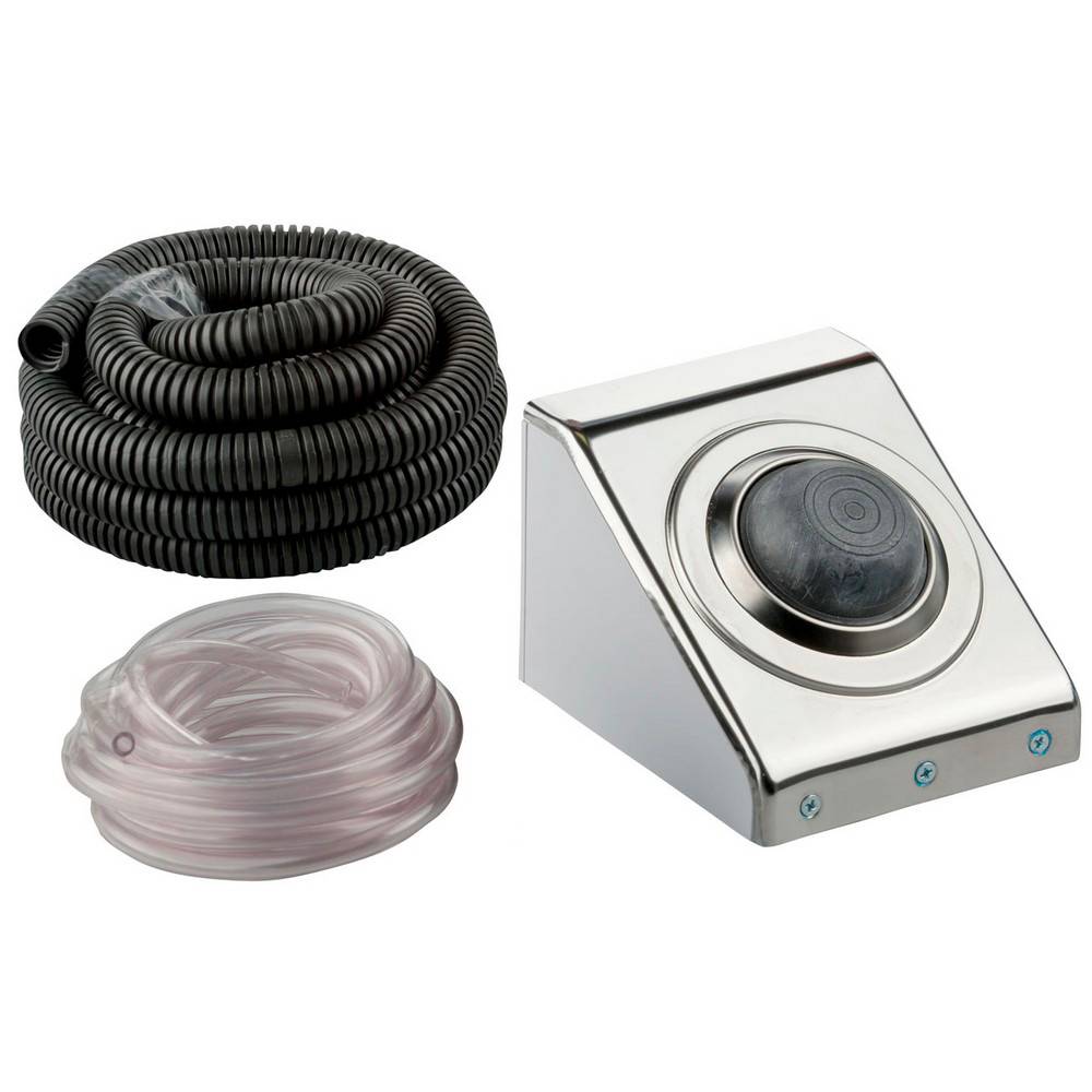 Pulsante PNEU a pedale per montaggio esterno a pavimento o a parete con placca in acciaio inossidabile. Completo di tutti gli accessori per il montaggio.