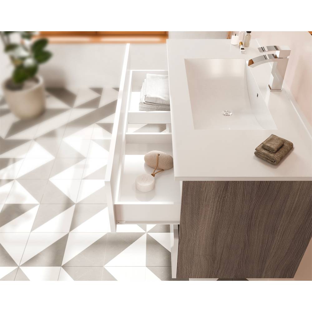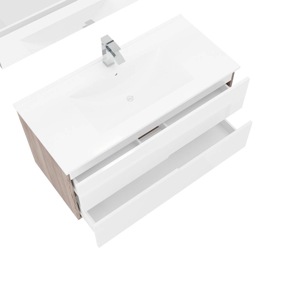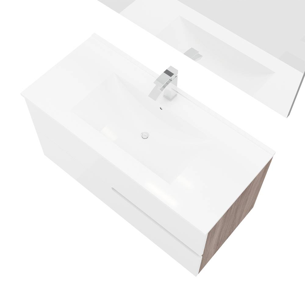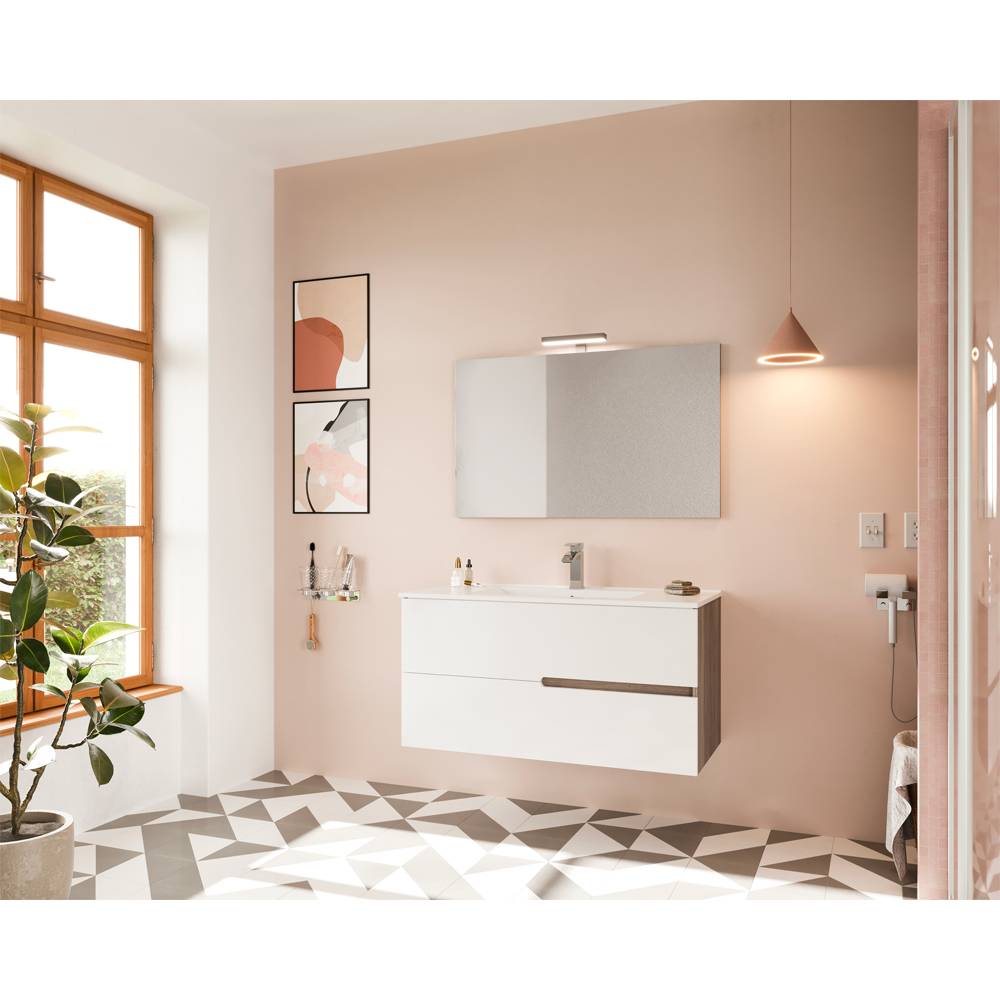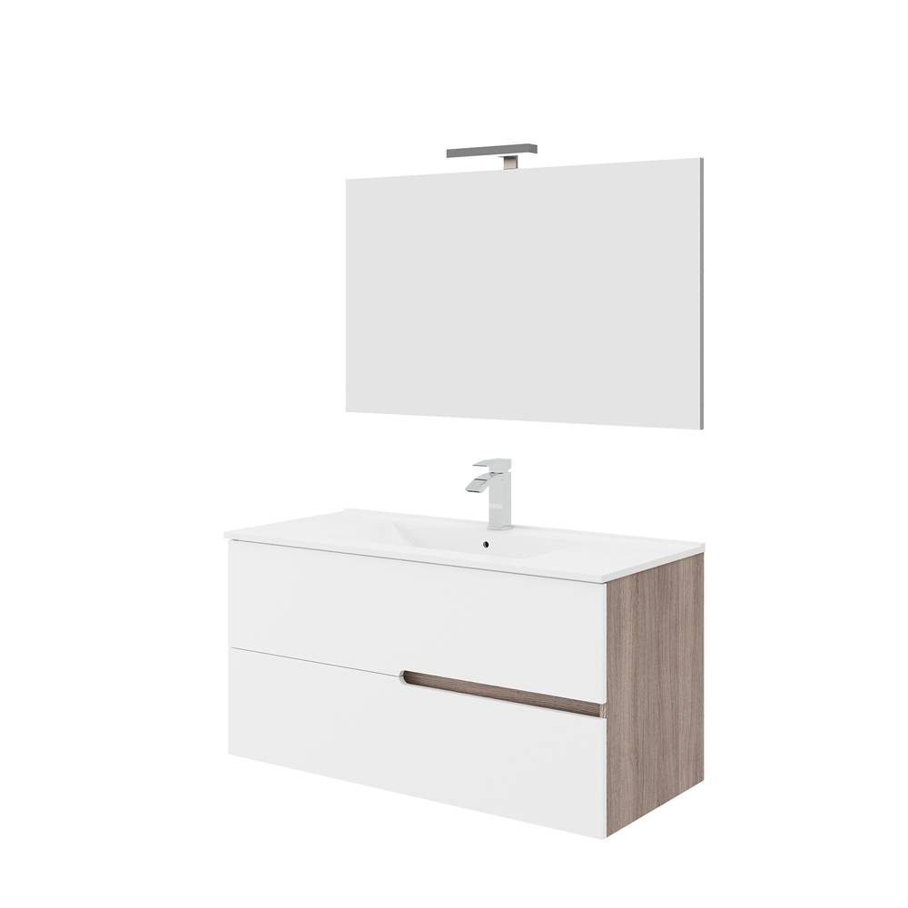 Composizione composta da: - Base sospesa da 100 cm; - Lavabo in ceramica da incasso; - Specchio 100x60 cm; - Lampada a LED. Base sospesa in laminato nobilitato finitura laterale e gole in Rovere Fumo, con ante in MDF laminato Bianco lucido. Bordatura ABS. Cassetti con chiusura rallentata.
