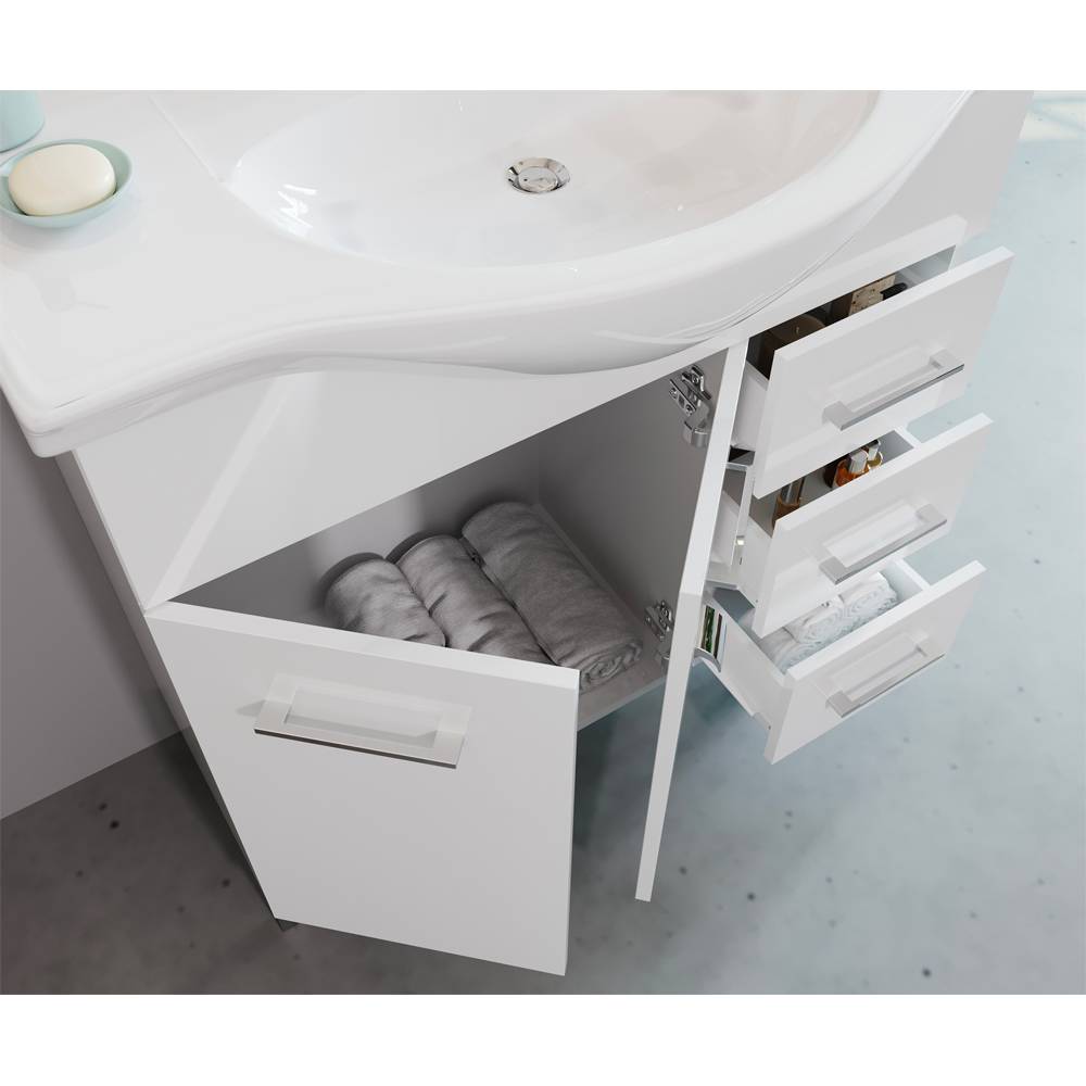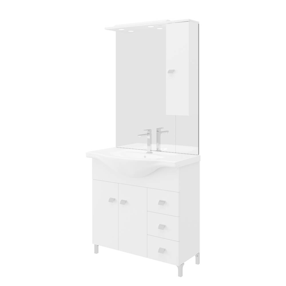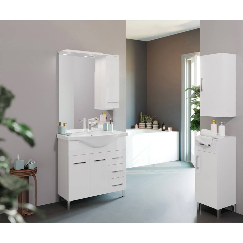 Composizione composta da: - Base a terra 85 cm con 2 ante e 3 cassetti; - Lavabo in ceramica 85 cm; - Specchiera 81x103,6 cm con pensile Destro e 2 faretti a Led. Illuminazione a LED IP44. Frontale in MDF rivestito in PVC con pellicola di protezione, laterali laccati UV bianco lucido. Piedini regolabili cromati. Maniglie in ABS cromate.
