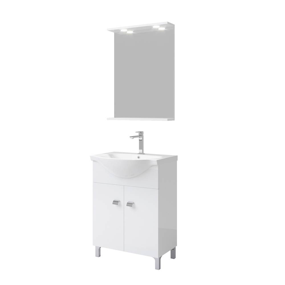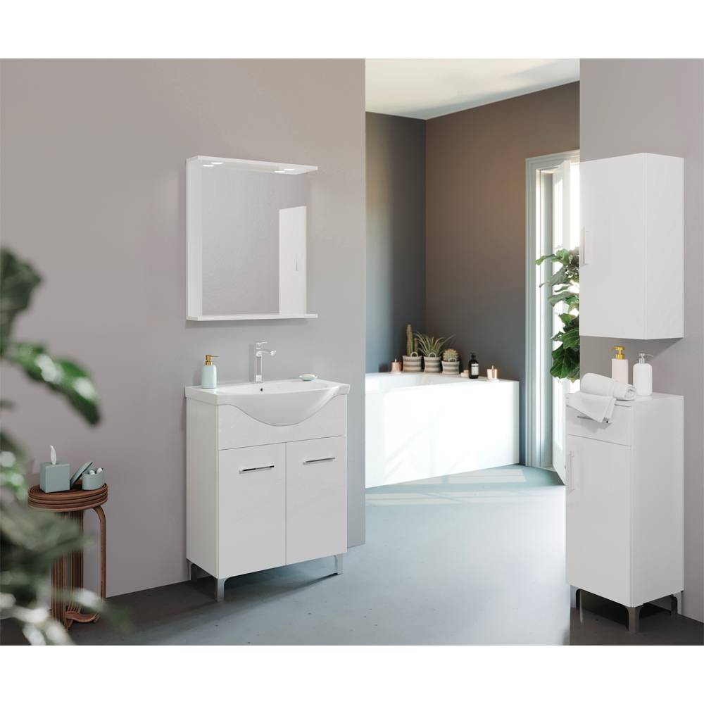 Composizione composta da: - Base a terra 65 cm con 2 ante; - Lavabo in ceramica 65 cm; - Specchiera 62x71 cm con mensola portaoggetti e 2 faretti a Led. Dimensioni: L. 65 x H. 88,5 x P. 45,5 cm. Frontale in MDF rivestito in PVC con pellicola di protezione, laterali laccati UV.
