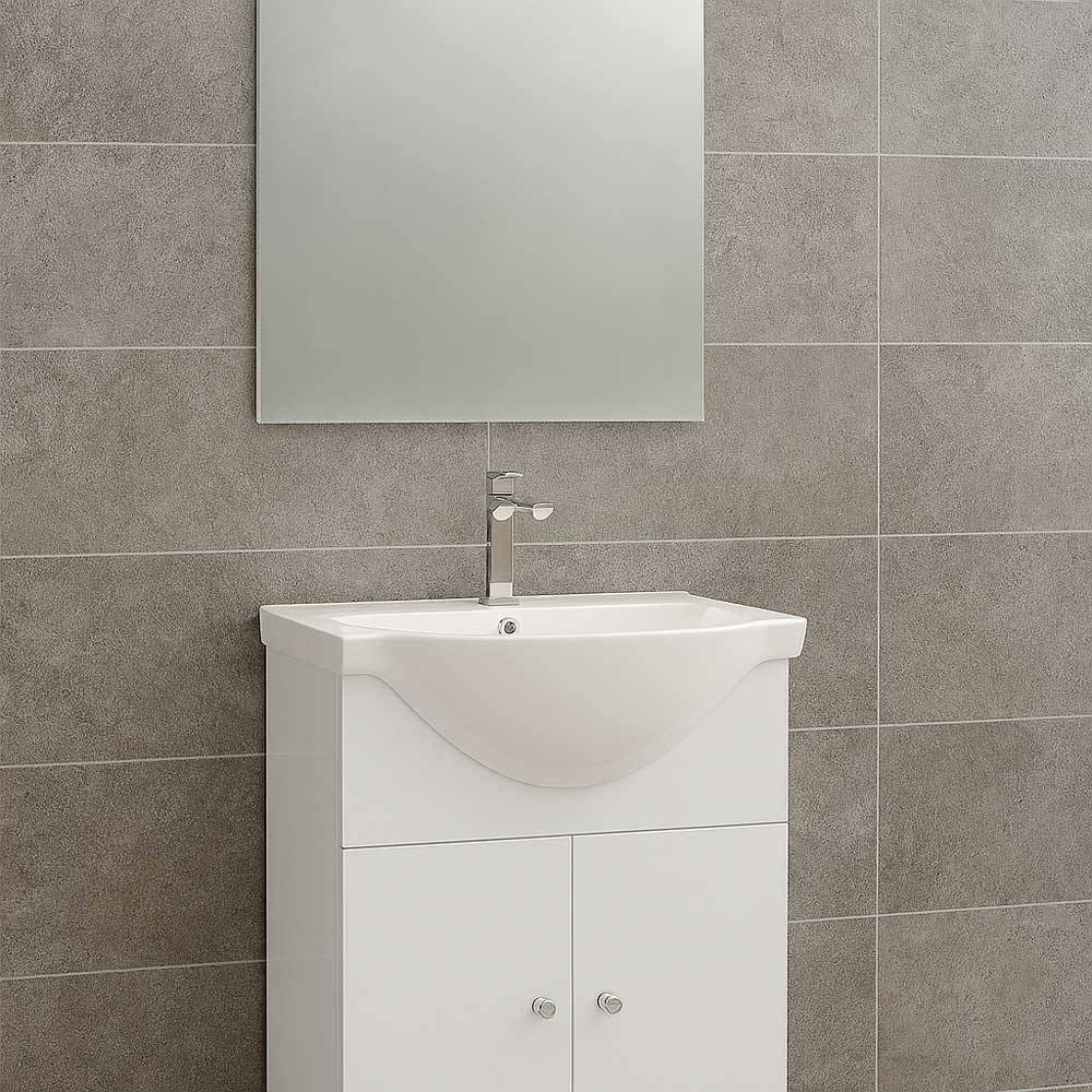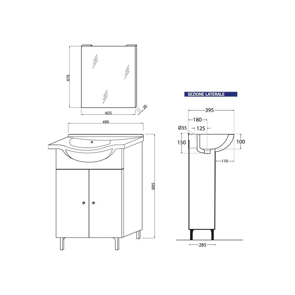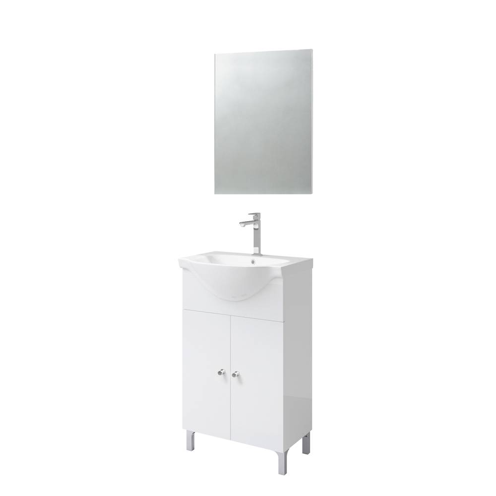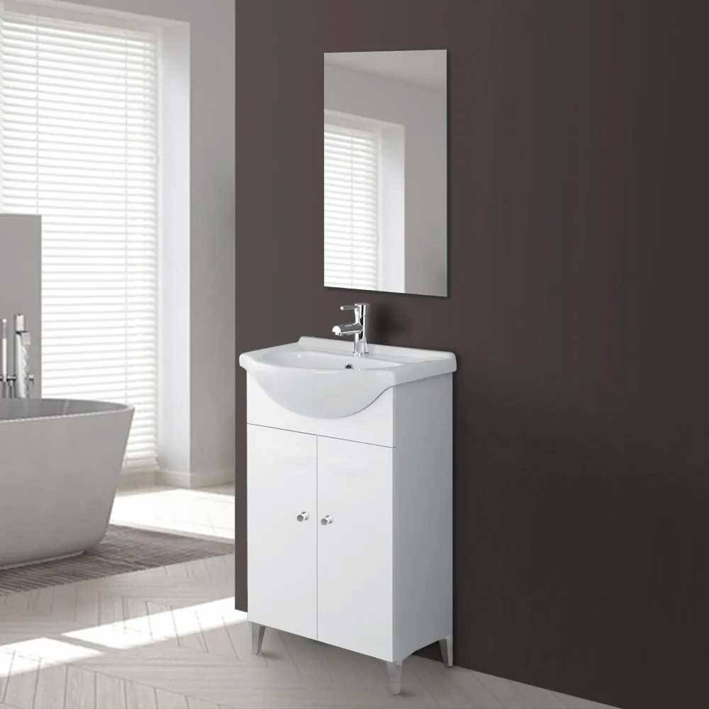 Composizione completa di: - Base a Terra 50 cm con 2 ante; - Lavabo in ceramica da 50 cm. - Specchio 40,5x67,8 cm. Frontale in MDF rivestito in PVC con pellicola di protezione. Laterali laccati UV bianco lucido.