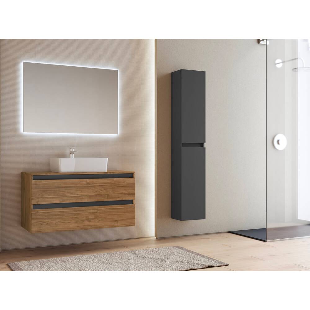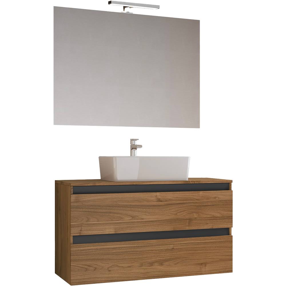 Composizione sospesa con Top. Finitura Noce, con gole in grafite Opaco. Cassettoni in Legno telato con guida ammortizzata in apertura e con chiusura ammortizzata. Composizione da completare con uno dei nostri lavabi da appoggio presenti a Catalogo. Per ottenere l'articolo come in Foto, acquistare i seguenti codici: - Base 91 cm (cod. 0148402); - Lavabo da appoggio a propria scelta (Categoria da T16 a T19) - Specchiera 100x70 cm Retroilluminata (cod. 0162006).