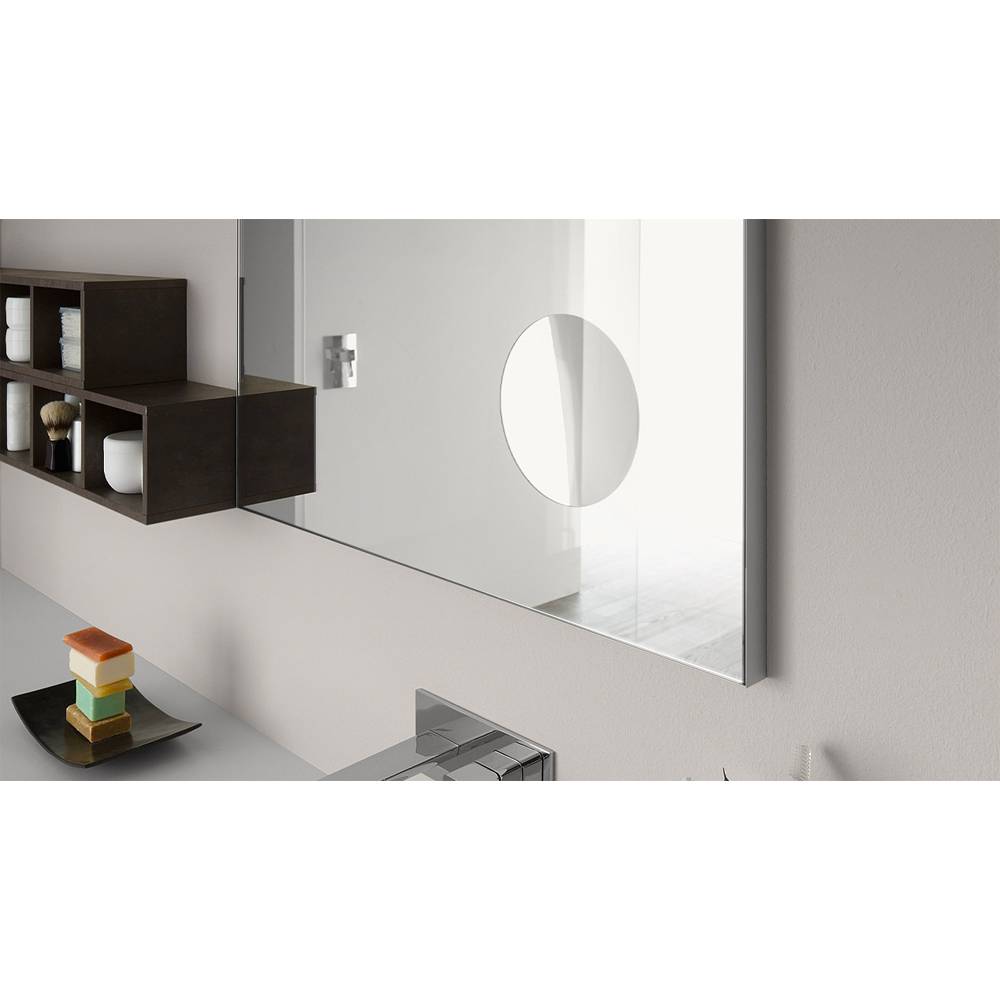 Con telaio a filo bordo in PVC color alluminio. Specchio ingranditore integrato 3X. Reversibile