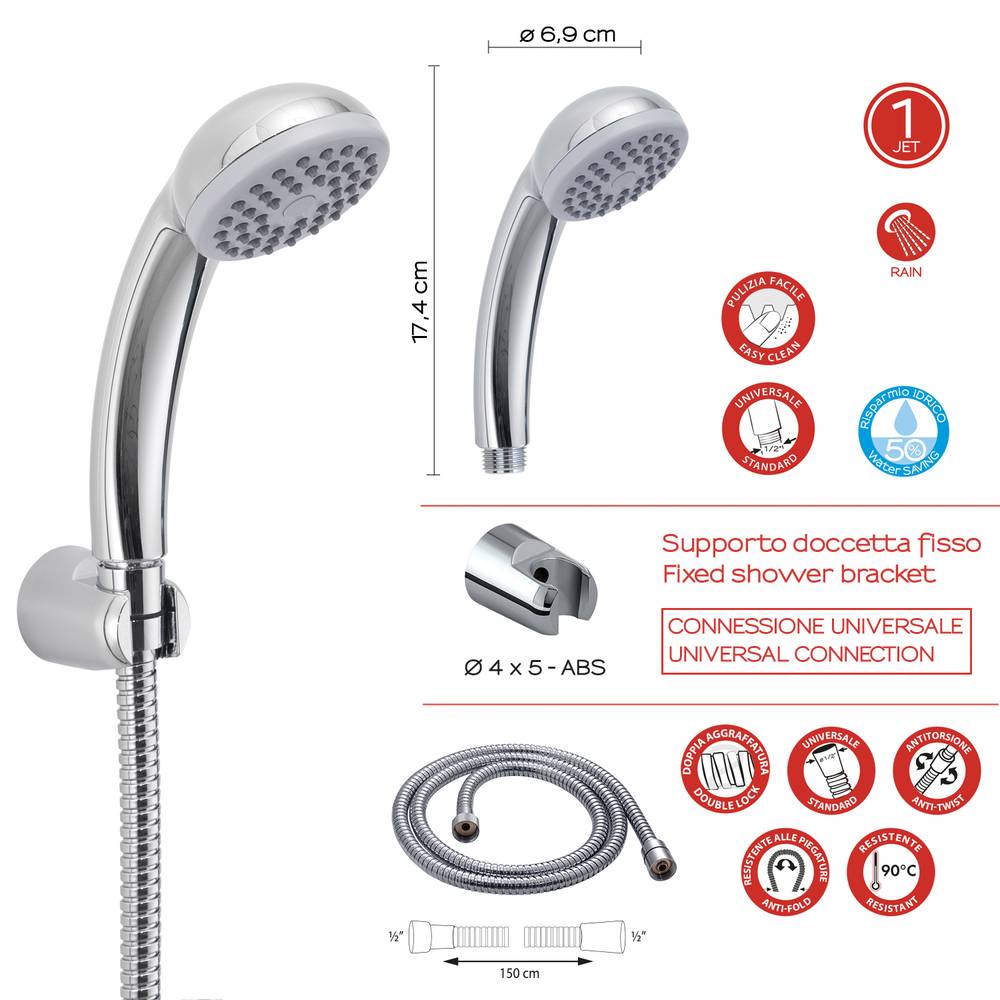 Kit doccia - Doccetta 1 getto; - Supporto fisso; - Flessibile inox 150 cm doppia graffatura 1/2"x1/2" con conico antitorsione.