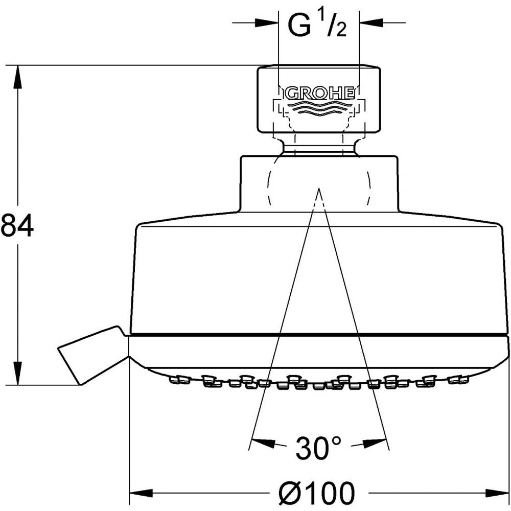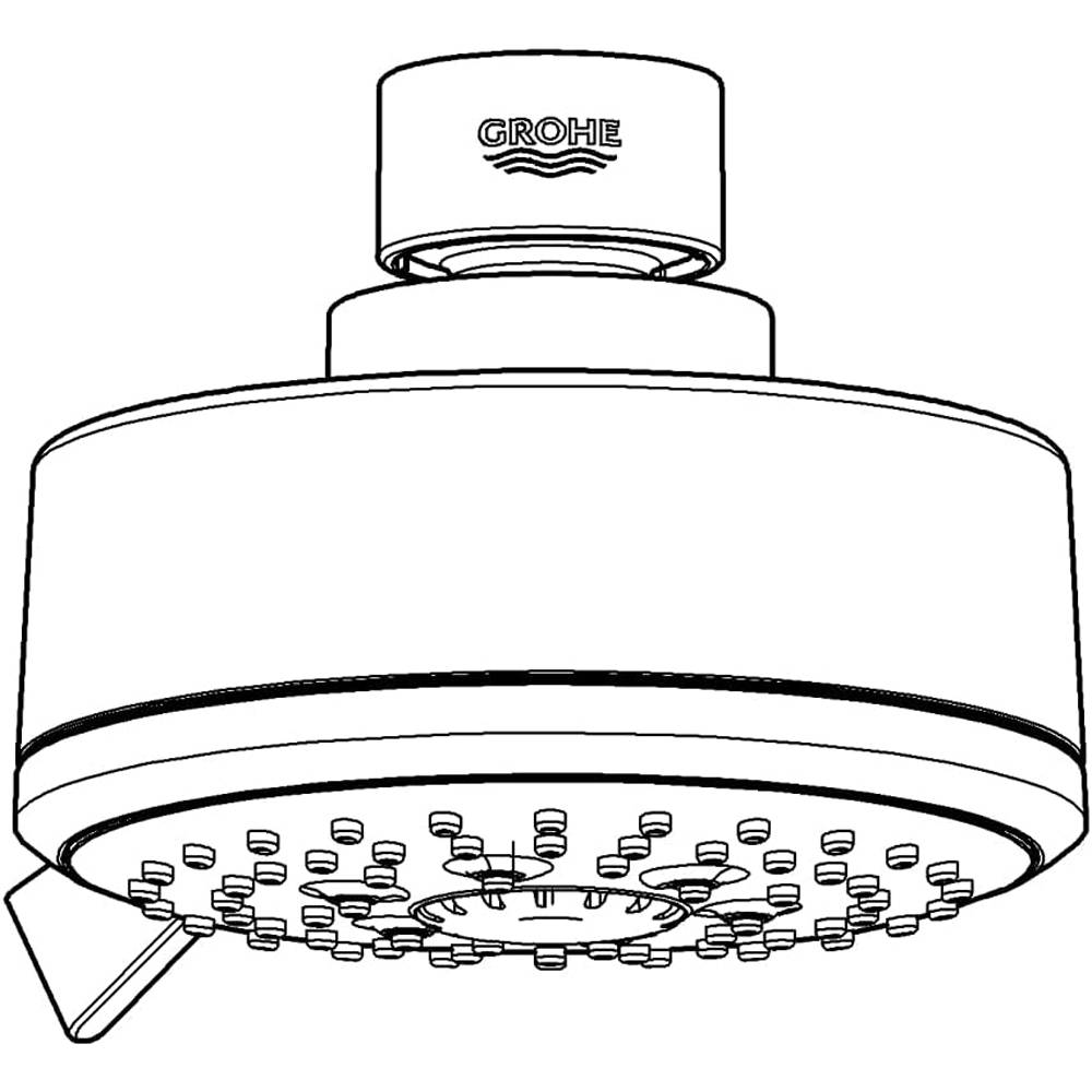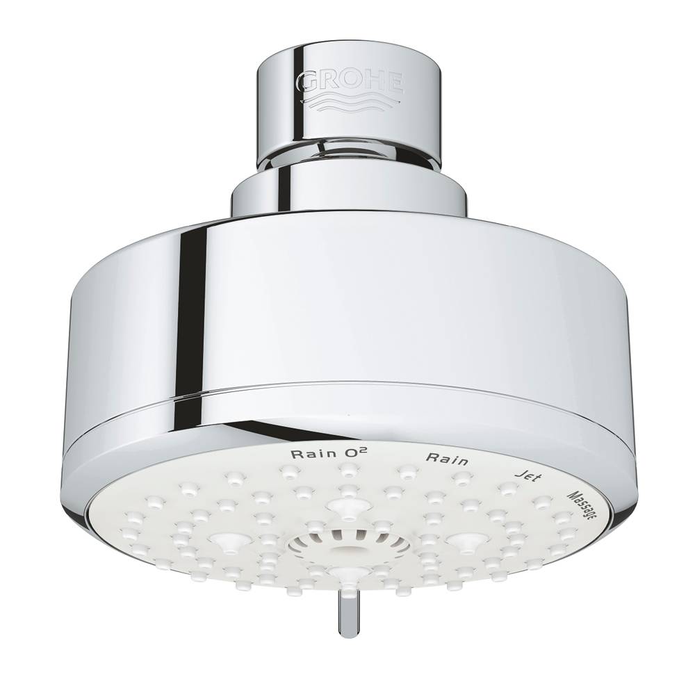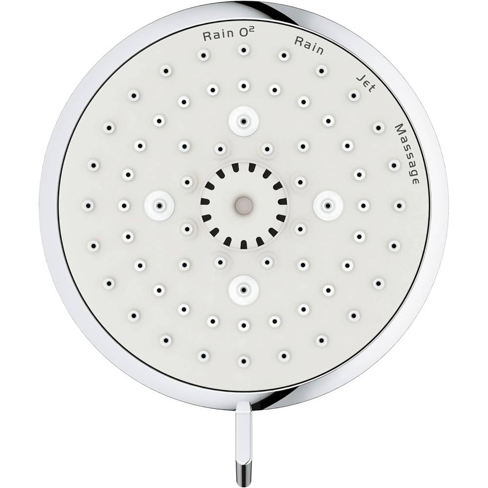 Soffione doccia a 4 getti: GROHE Rain O², Rain, Massage, Jet. Raccordo a sfera con angolo di inclinazione orientabile ± 15°. Raccordo da 1/2". GROHE Water Saving (portata limitata a 9,5 l/min). GROHE DreamSpray per un getto sempre perfetto. Sistema anticalcare SpeedClean.