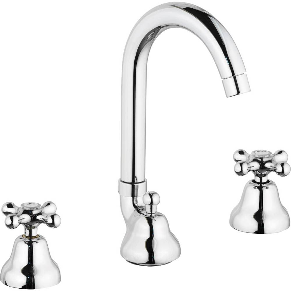 Rubinetteria per lavabo a 3 Fori. Fornito completo di piletta di Scarico da 1"1/4 e flessibile di raccordo idrico da 1/2". Con canna alta, H. 277 mm. Finitura: Cromo Per renderlo a chiusura ceramicata ordinare nostro codice: 0423202
