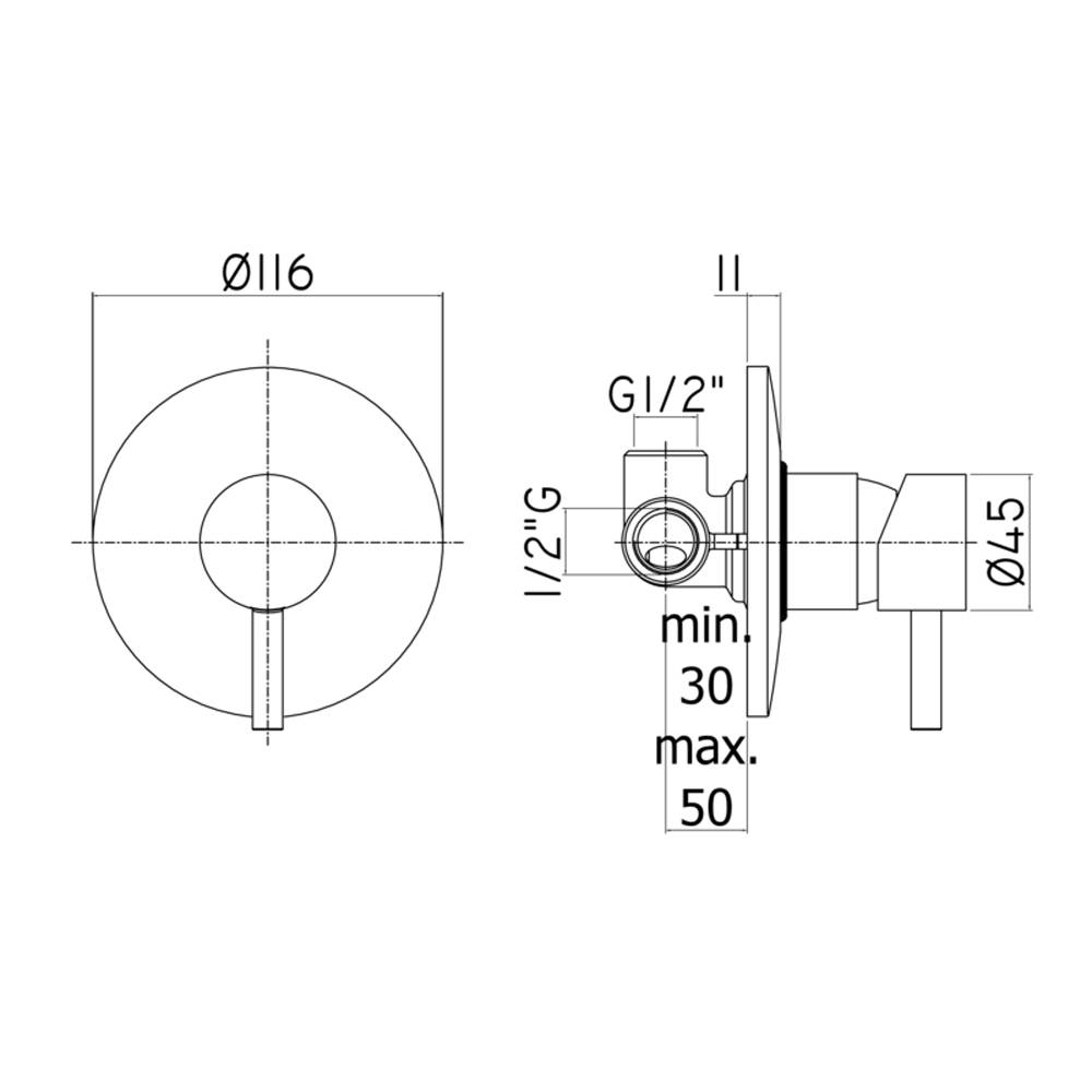 Miscelatore incasso doccia (1 Uscita). Fornito completo di: - Piastra in metallo Ø 116 mm; - Attacchi 1/2" G. Cartuccia di ricambio nostro codice 04196. Prolunga per miscelatore nostro codice 0337102