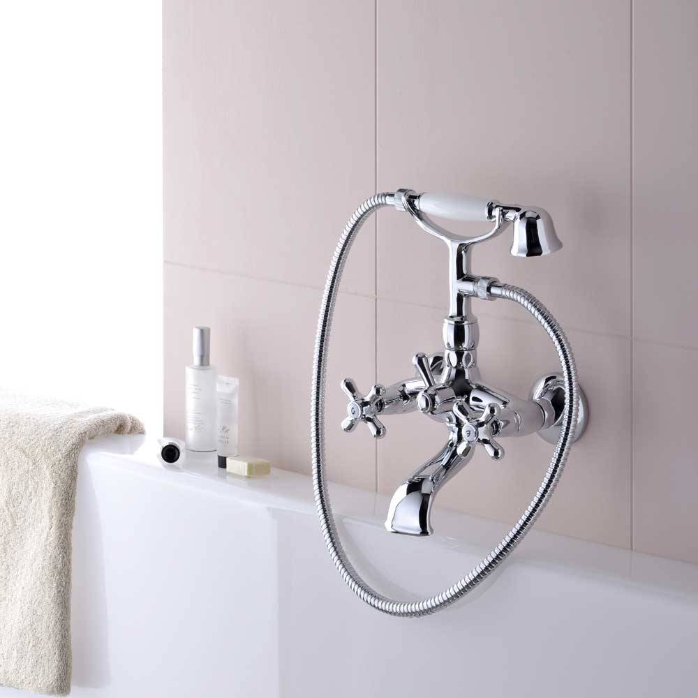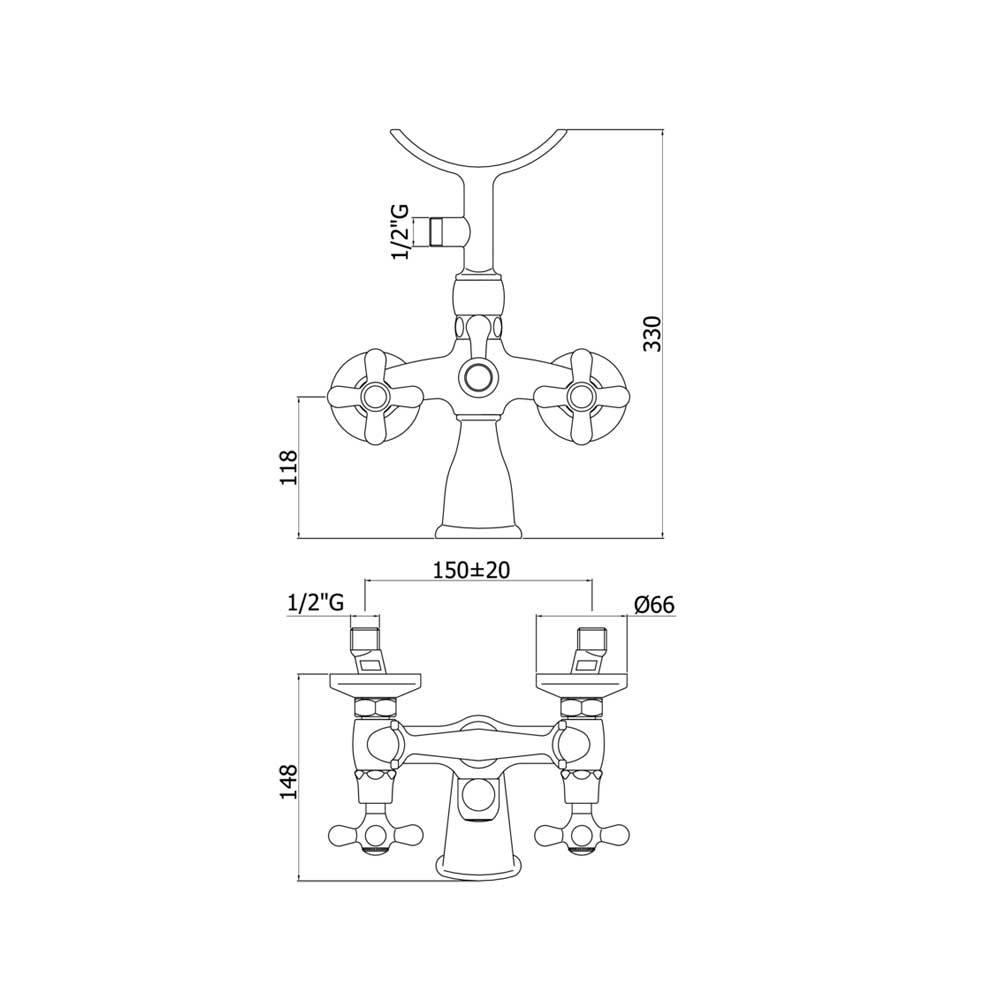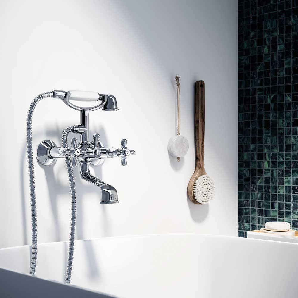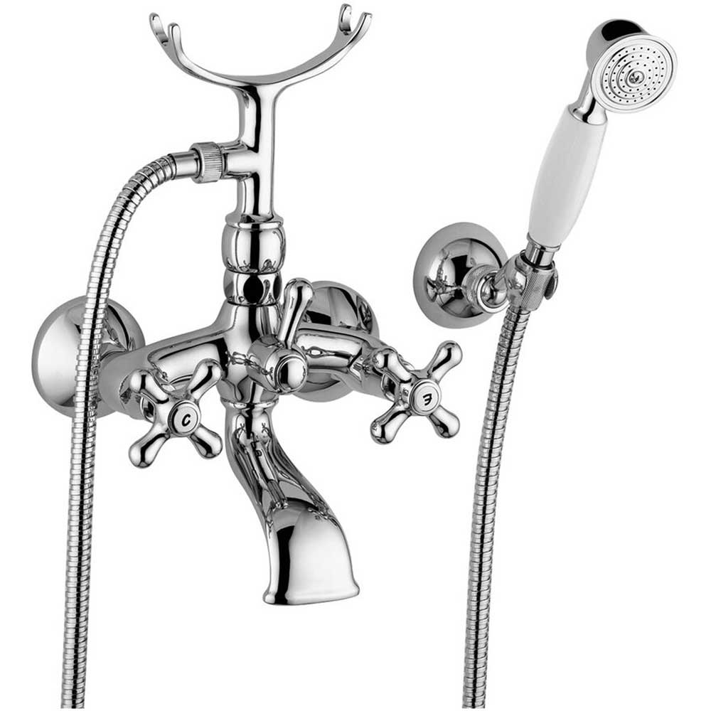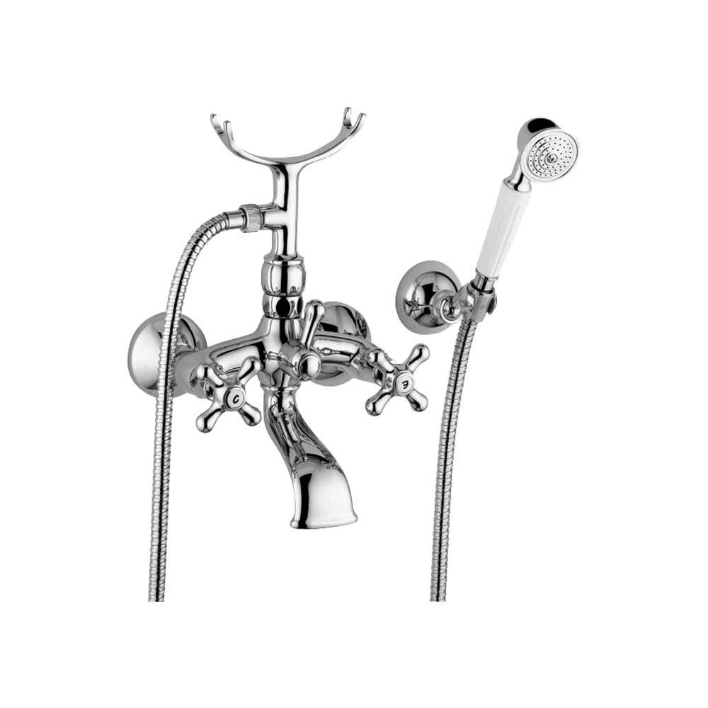 Gruppo Vasca/doccia Stile Retrò, Serie IRIS con deviatore. Fornito completo di: - Forcella; - Doccetta Iris in metallo; - Set 2 eccentrici 1/2"x3/4" G e Rosoni. Vitoni in ceramica di ricambio nostro articolo 04186.