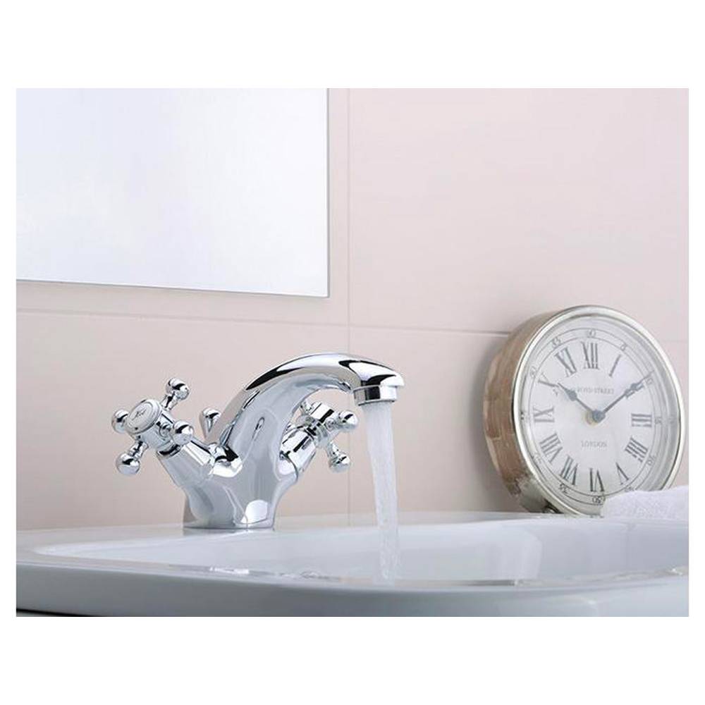 Serie Iris. Rubinetteria stile tradizionale con le maniglie a Croce. Senza attacco catenella. Fornito completo di: - Aereatore M24x1"; - Set 2 Flessibili Inox 3/8" G; - Piletta di Scarico 1"1/4. Vitoni in ceramica di ricambio nostro articolo 04186.