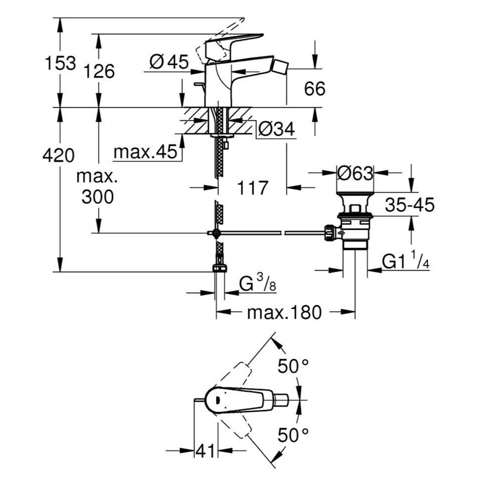 Con leva in metallo. Cartuccia a dischi ceramici GROHE Long-Life da 28 mm. Dotato di serie di limitatore di temperatura. Con tecnologia GROHE Water Saving per il risparmio idrico. Portata massima (a 3 bar): 5 l/min Con raccordo a sfera orientabile. Rapido sistema di installazione. Fornito completo di piletta di scarico a saltarello 1"1/4
