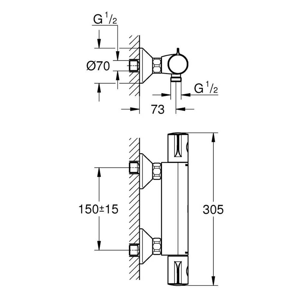 Installazione a parete - GROHE SafeStop, manopola graduata per impostare la temperatura con blocco di sicurezza a 38°. GROHE Safe Stop Plus, limitatore di temperatura opzionale a 43°C - elemento termostatico GROHE TurboStat - valvola di chiusura dell'acqua integrata - manopola con limitatore di portata GROHE EcoButton per risparmio d'acqua fino al 50% - vitone a dischi ceramici 1/2", 180° - attacco del flessibile da 1/2" - raccordi ad S - rosone metallico - con tecnologia GROHE Water Saving per il risparmio idrico