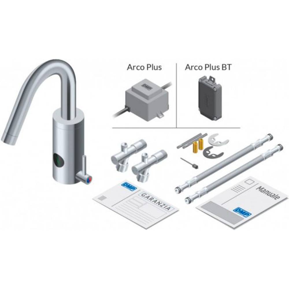 Rubinetto elettronico con "DMP Infrared Sensor" antigraffio e anticalcare. Circuito elettronico da 4,5 V a tenuta stagna integrale. Raggio d'azione dei sensori regolabile da 5 a 35 cm. Microchip programmato per il perfetto controllo delle funzioni. Funzioni ottimizzate tramite software integrato DMP. Corpo in ottone cromato lucido. Disponibili diverse lunghezze di canna. Modalità flusso continuo. Funzione di blocco momentaneo. Stop automatico anti-allagamento dopo 90 secondi. Portata acqua standard: 6 litri/minuto. Rubinetti d'arresto con filtri inox e valvole di non ritorno incorporati Per modelli a pile. Pile alcaline tipo AA da 1,5V. Autonomia pile: 4 anni a 200 azionamenti al giorno. Avviso pile scariche tramite led sui sensori. Box portapile a tenuta stagna integrale. Per modelli a corrente Trasformatore di sicurezza 230Vac - 5Vdc