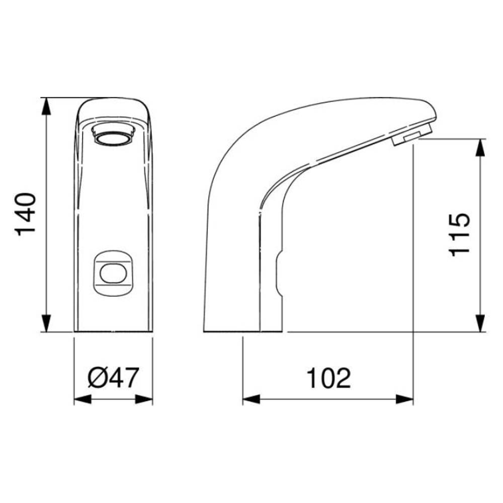 Corpo realizzato in ottone cromato. Comando a fotocellula con attivazione a rilevamento di presenza. Chiusura antivandalo dopo 1 minuto di erogazione continua. Erogazione automatica anti-ristagno ogni 24h dall'ultimo utilizzo. Elettrovalvola 6V esterna ispezionabile. Batterie alkaline "AA" 4×1,5V (150.000 azionamenti). Alimentatore esterno 230V - 6V