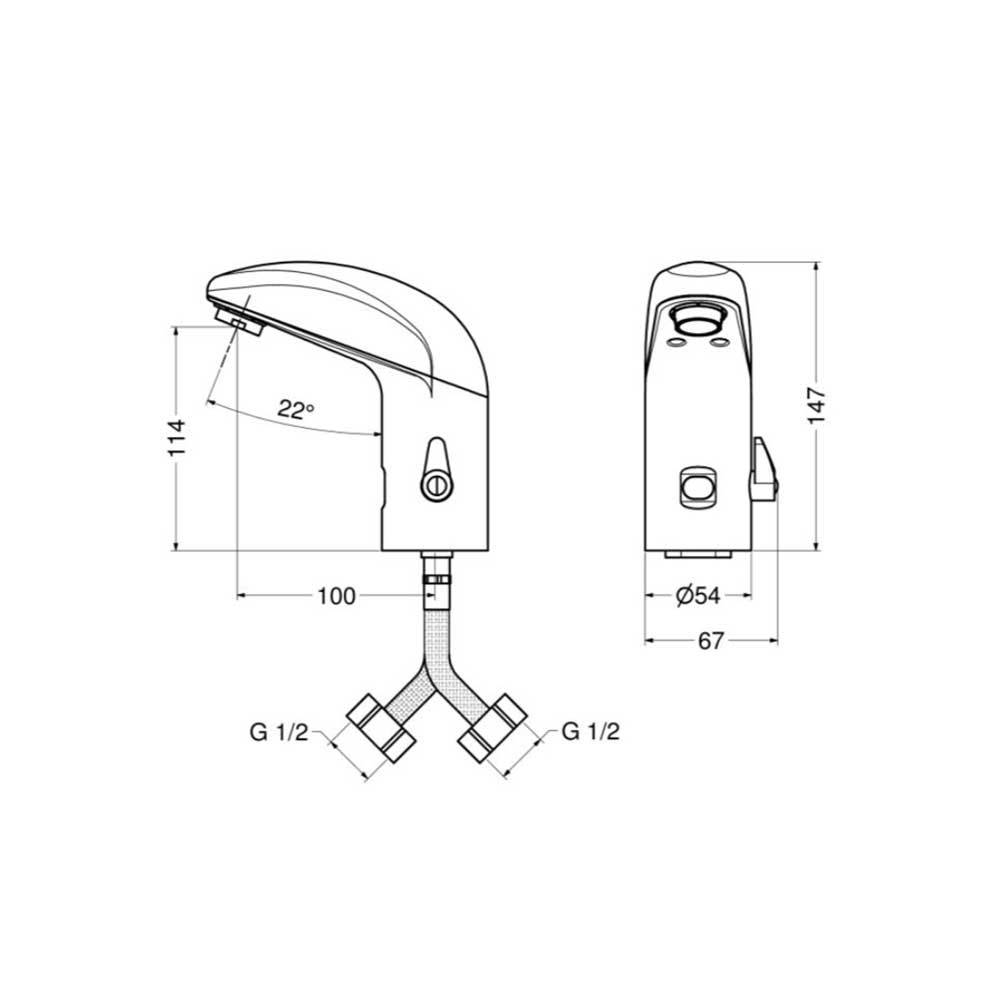 Dispositivo di miscelazione a leva laterale con possibilità di limitazione e blocco della temperatura massima erogabile mediante l'uso di un piccolo accessorio accluso. Comando a fotocellula con attivazione a rilevamento di presenza. Chiusura antivandalo dopo 1 minuto di erogazione continua. Erogazione automatica anti-ristagno ogni 24h dall'ultimo utilizzo Elettrovalvola 6V integrata. Valvole di ritegno. Batteria al litio 6V interna - tipo CR-P2; Alimentatore esterno 230V - 6V