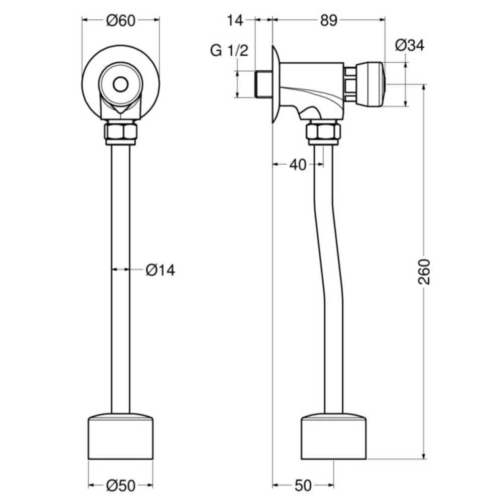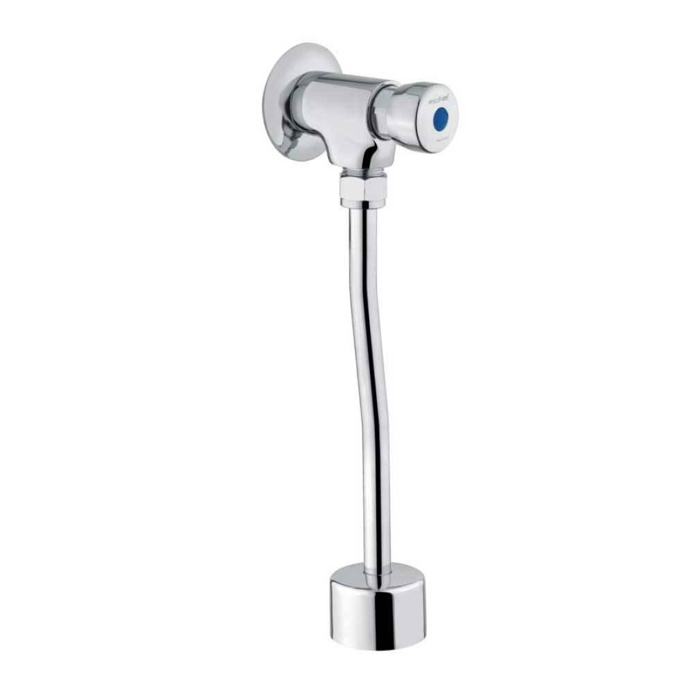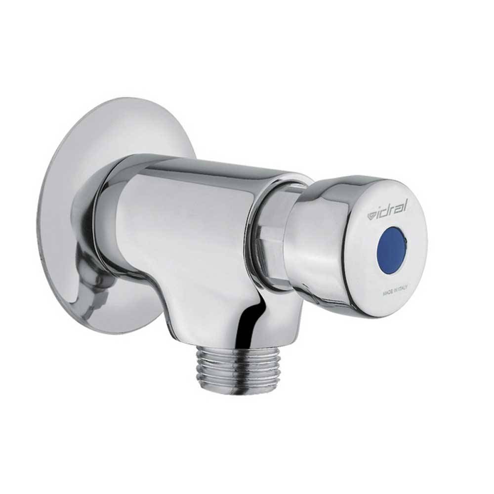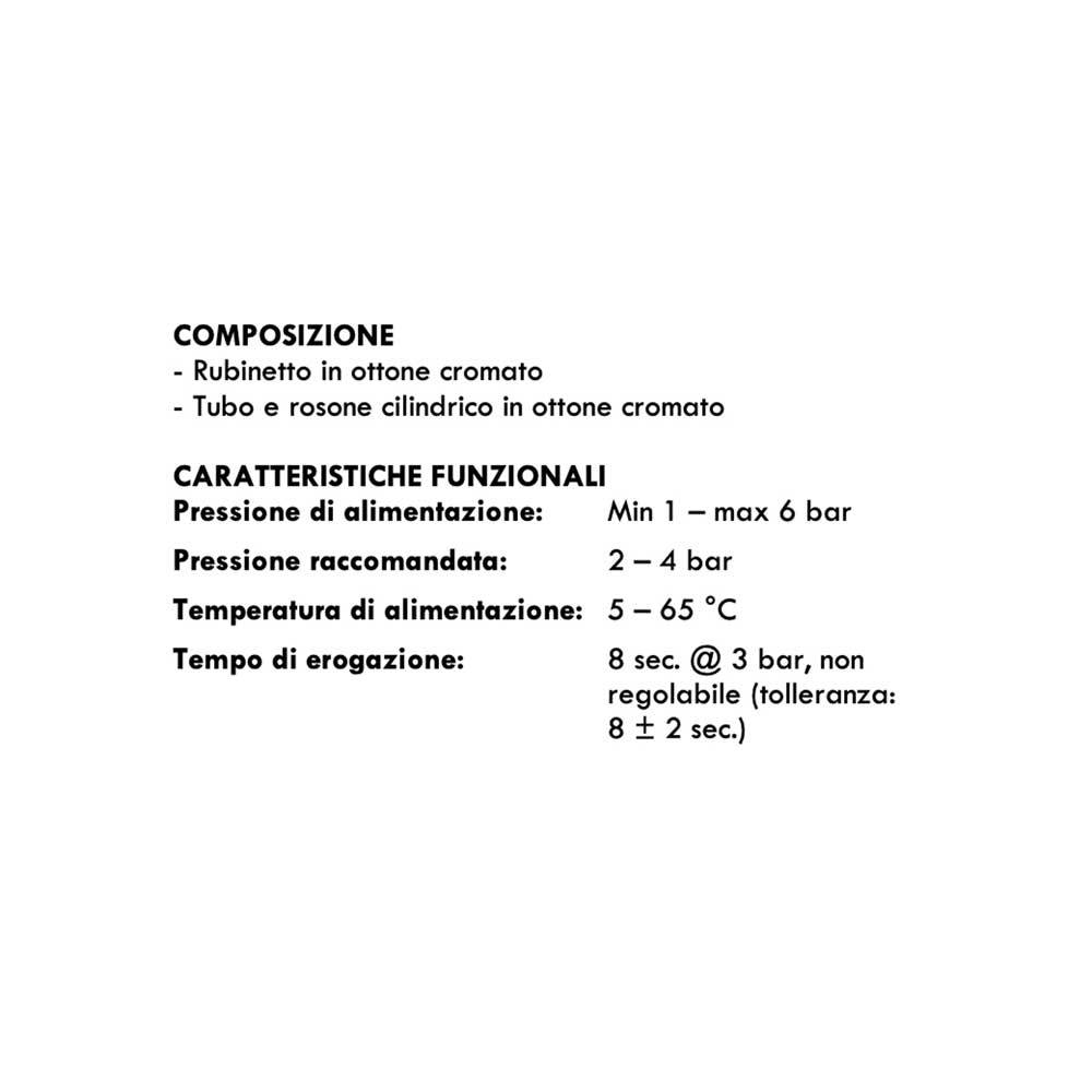 Corpo in Ottone Cromato. Comando a Pulsante. Arresto temporizzato 6 secondi, a 3 bar non modificabile. Completo di tubo d.14 e rosone a campana cromato. Vitone di ricambio 0441406