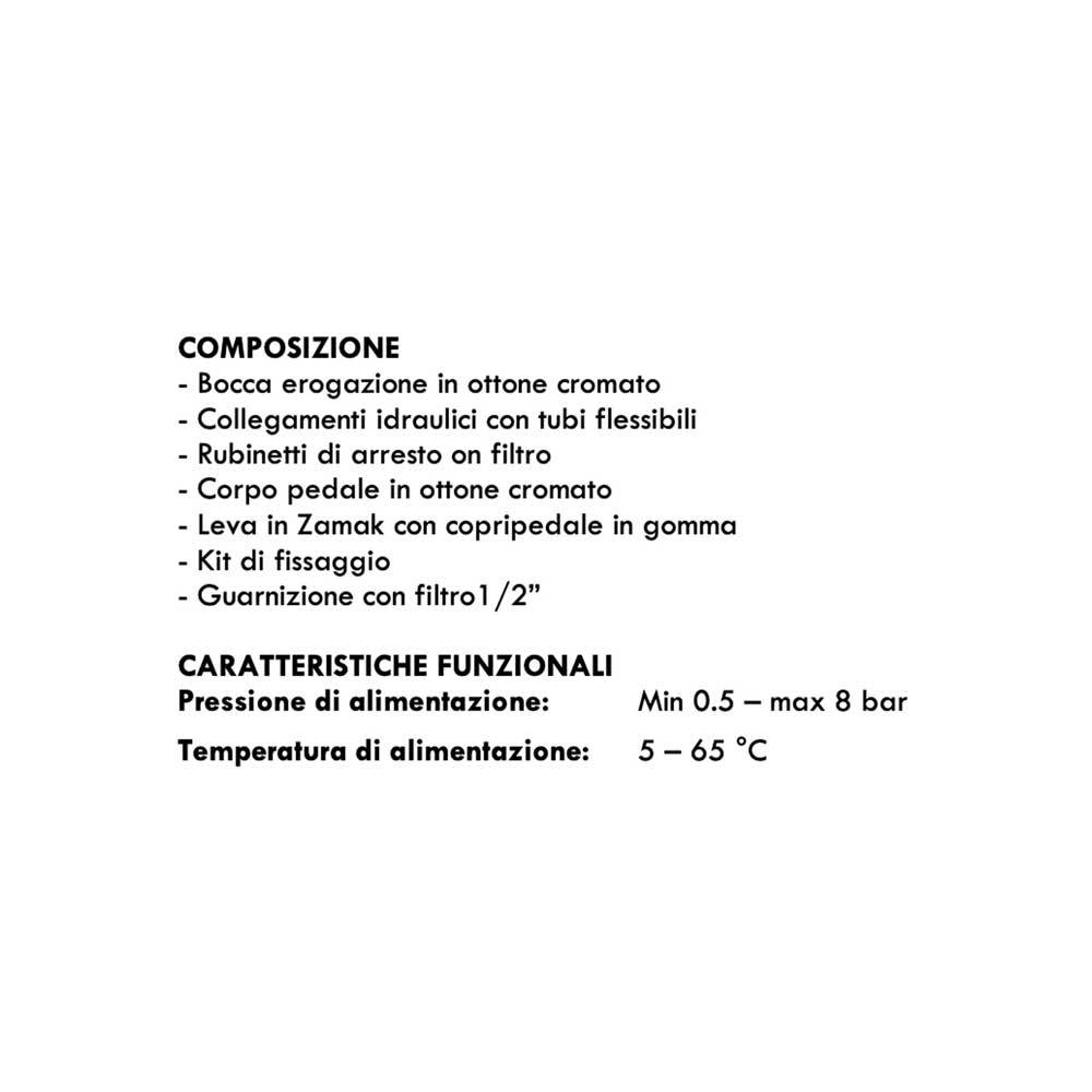 Kit composto da: - Miscelatore monopedale art. 02070, - Bocca di erogazione art.02026, - Collegamenti idraulici con tubi flessibili, - Rubinetti di arresto con filtro