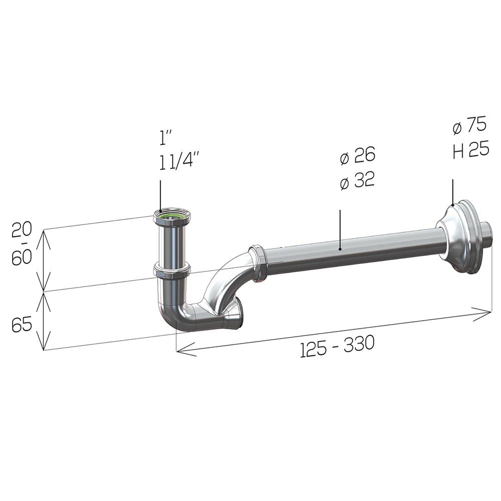 Sifone Colonna con tappo di ispezione posteriore in ottone cromato per Lavabo/Bidet. Regolabile cm. 7,5 e tubo di uscita in acciaio cromato