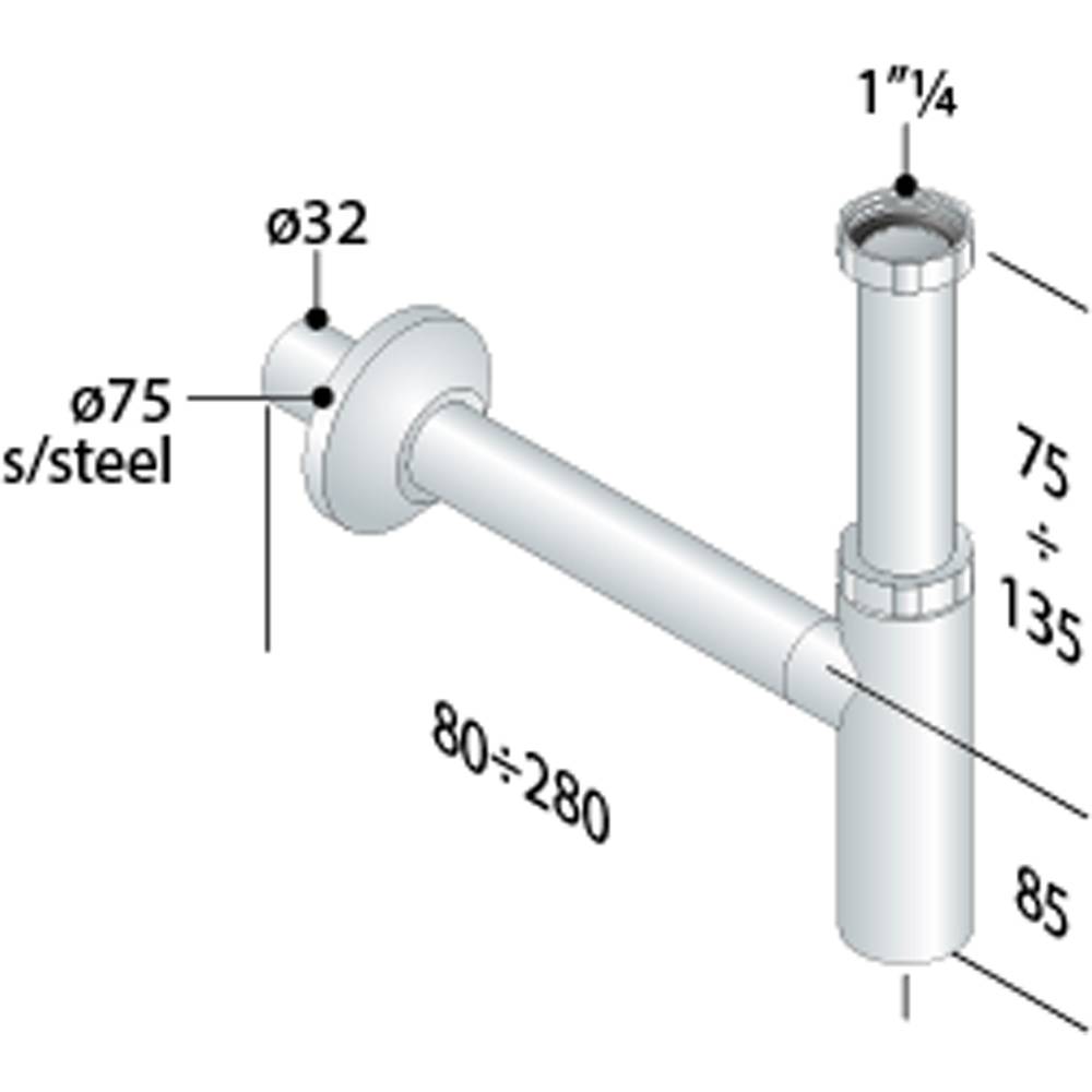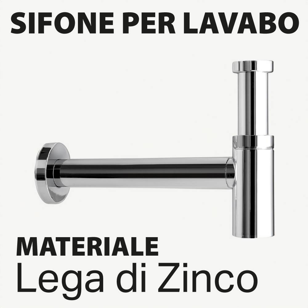 Sifone in lega di zinco per lavabo. Entrata H. max. 135 x 1"1/4. Uscita L. 250 x Ø 32. Rosone Ø 70 mm. Chiusura idraulica 50 mm. Portata d'acqua 35 l/min. Prodotto conforme alla norma europea EN274.