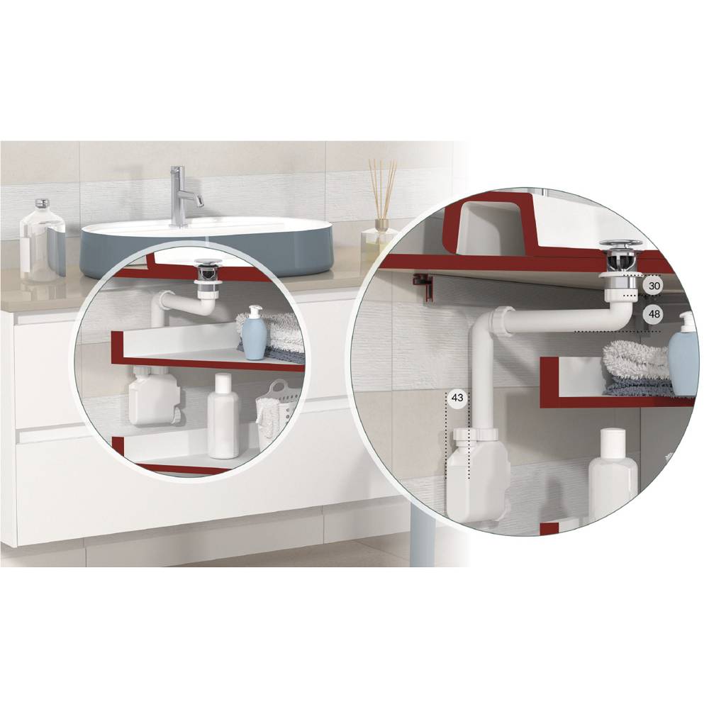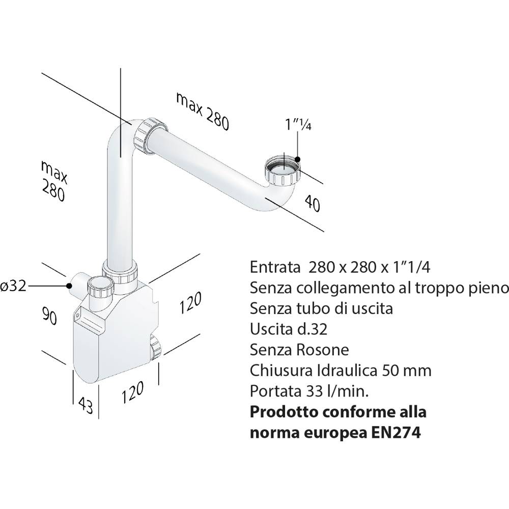 Sifone salvaspazio in ABS per lavabo. Entrata 280 x 280 x 1"1/4. Connessione rigida. Senza collegamento al troppo pieno. Uscita Ø32 mm. Senza tubo d'uscita. Senza Rosone. Ispezionabile. Ingombro a parete minimo 43 mm. Ingombro sotto-piletta minimo 32 mm.