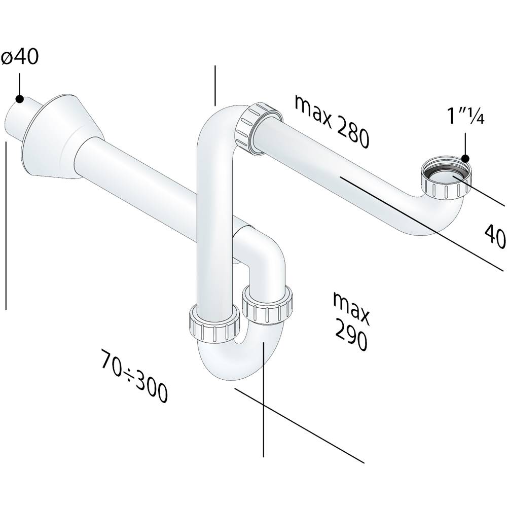 Sifone per lavabo salvaspazio in Polipropilene. Adatto per i mobili con i cassetti. Entrata 280 x 280 x 1"1/4. Connessione rigida. Uscita L. 300 mm x Ø 40. Rosone in Polipropilene Ø 78 mm. Chiusura Idraulica 50 mm. Portata: 44 lt/minuto. Conforme ai requisiti standard Europei EN274