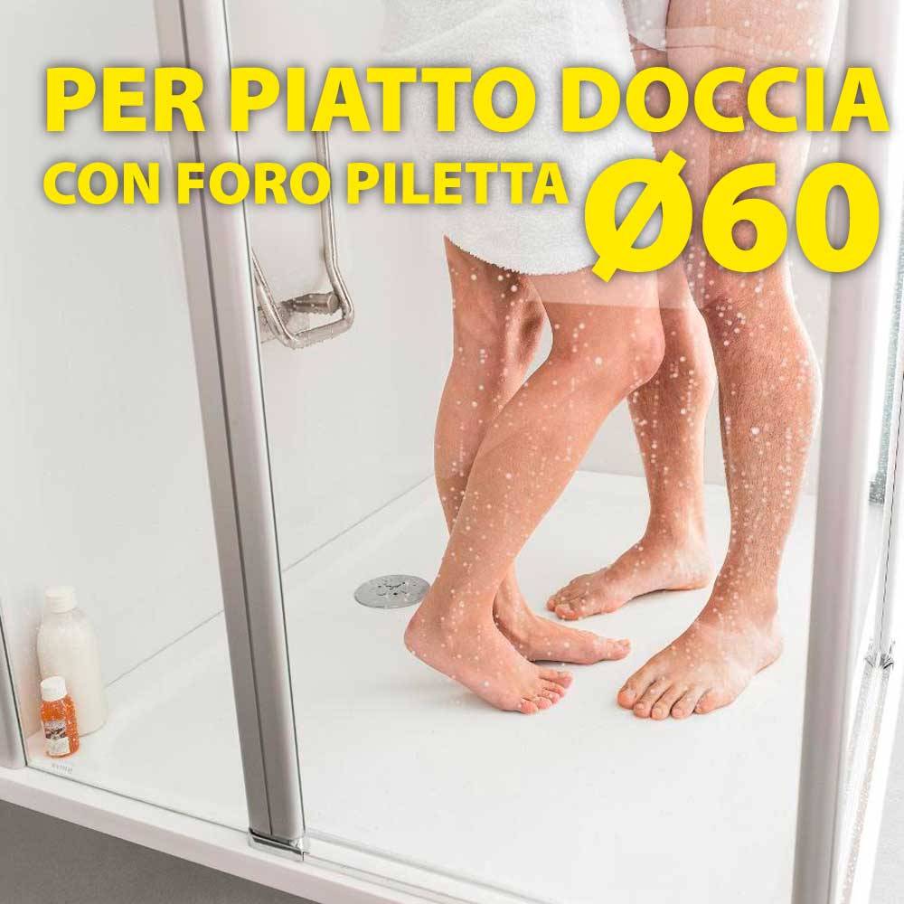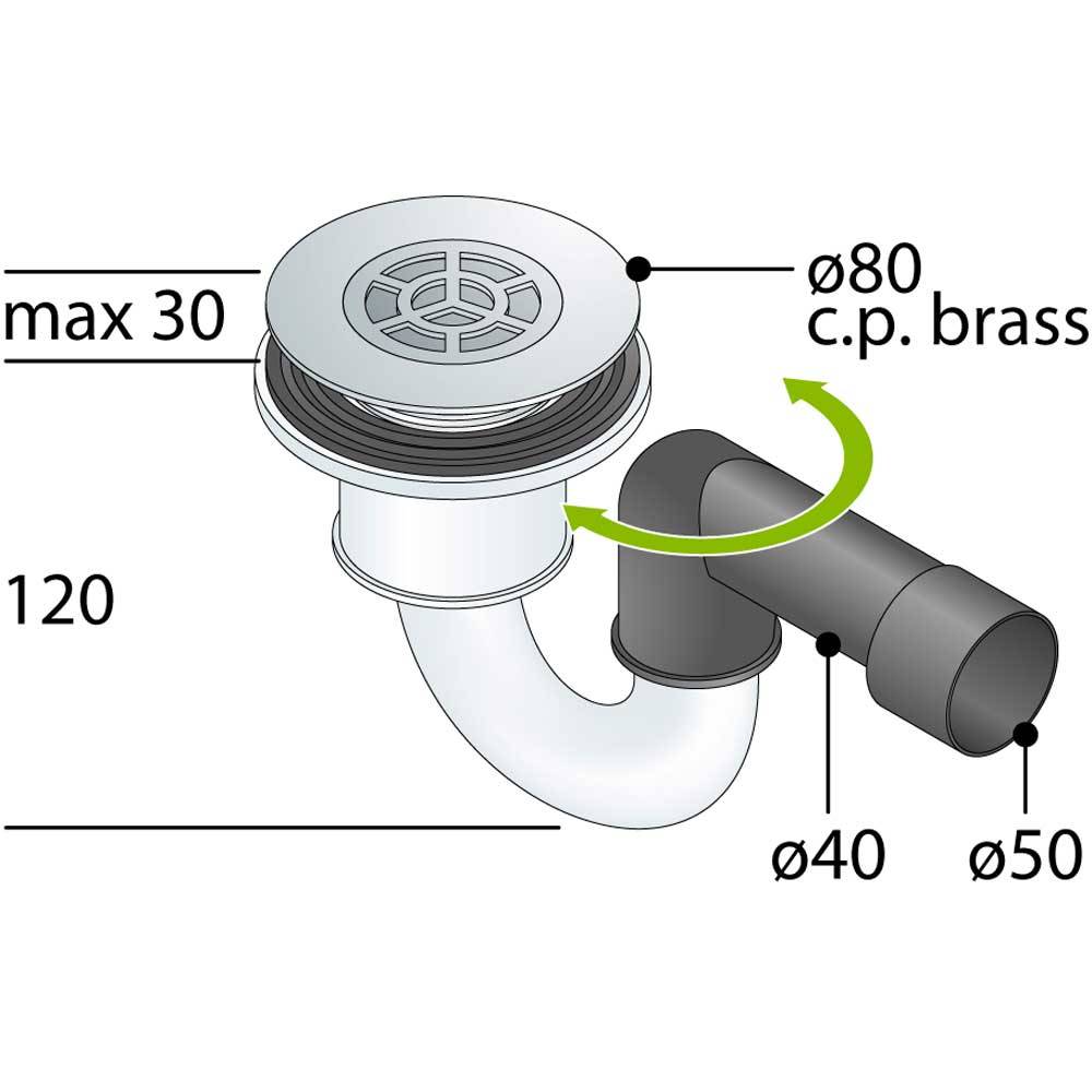 Piletta sifonata in PP per piatto doccia con foro Ø60 mm. Griglia Ø45 mm ottone cromato. Piletta Ø80 mm ottone cromato. Uscita laterale in PEHD Ø40/50 mm. Ingombro sotto piatto doccia 120. - Chiusura idraulica (mm): 50; - Portata d'acqua (l/min): 35. Prodotto conforme alla norma europea EN274
