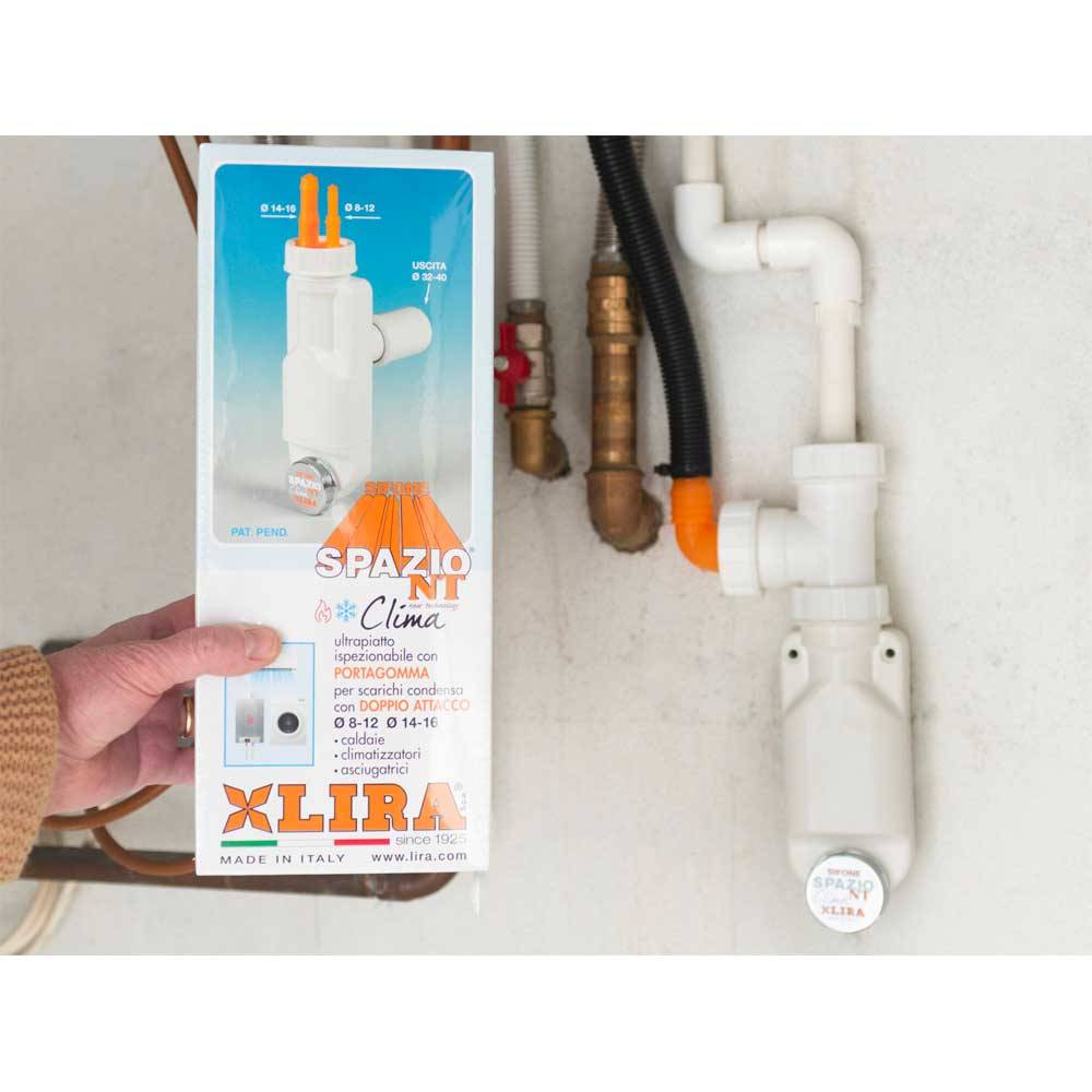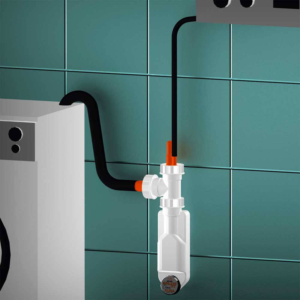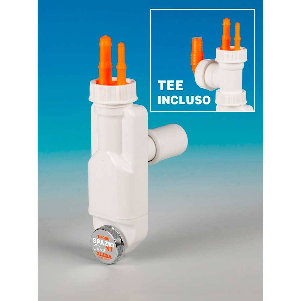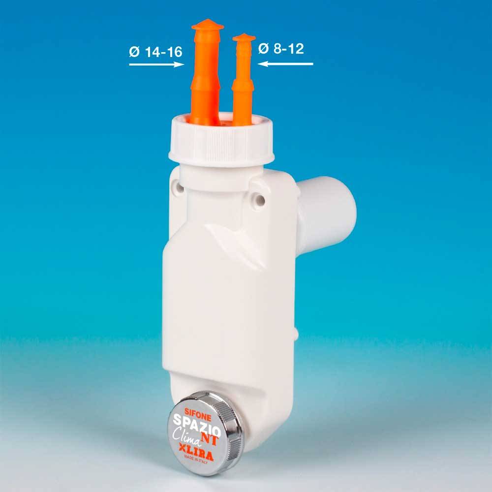 Sifone con portagomma per scarichi di piccolo diametro. Adatto per lo scarico di: - Caldaie a Condensazione; - Climatizzatori; - Deumidificatori; - Asciugatrici Ø 8-12-14-16; - Lavatrici; - Lavastoviglie Ø20-25. Completo di TEE con attacco Ø20-25 per lavatrice-lavastoviglie. UNI EN 274