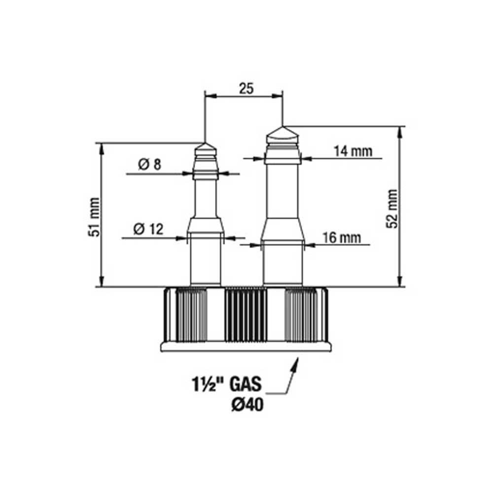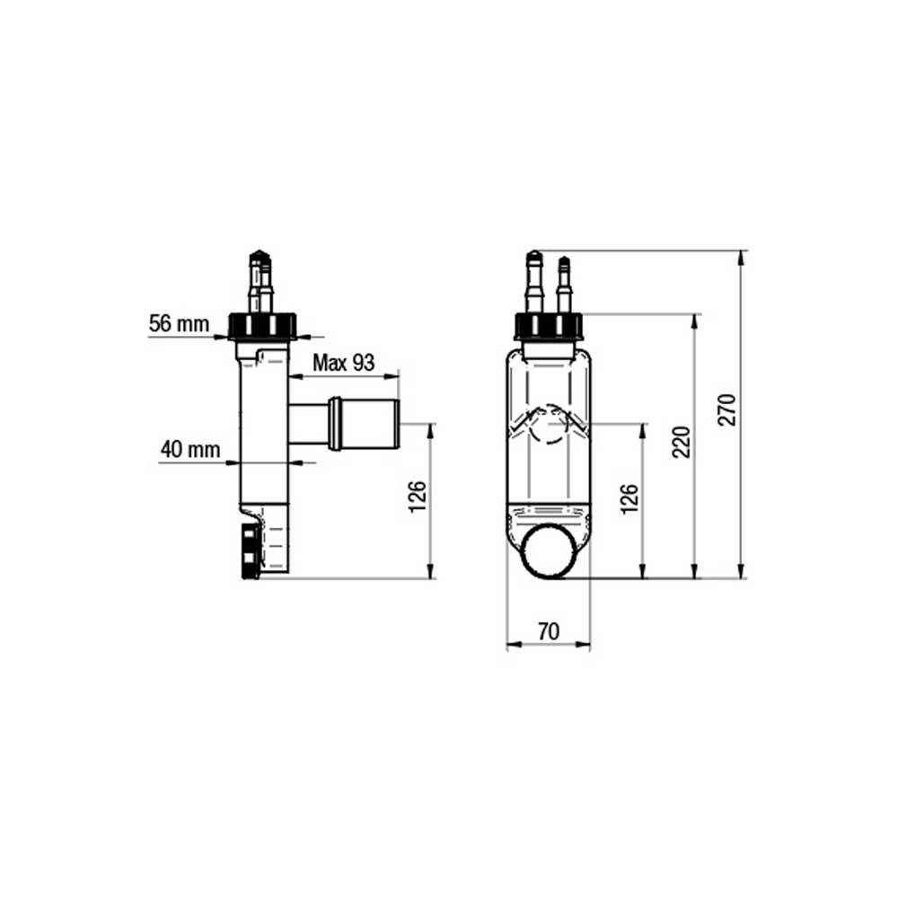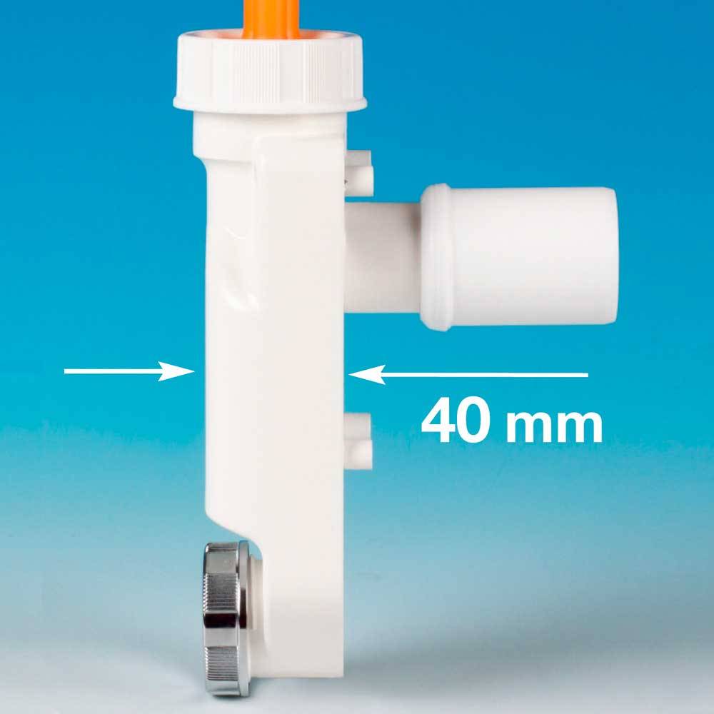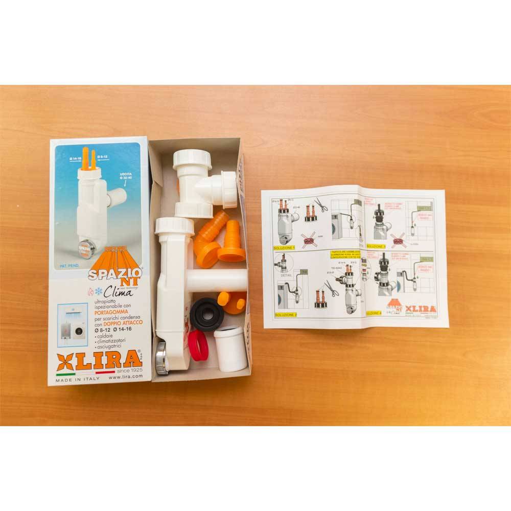Sifone con portagomma per scarichi di piccolo diametro. Adatto per lo scarico di: - Caldaie a Condensazione; - Climatizzatori; - Deumidificatori; - Asciugatrici Ø 8-12-14-16; - Lavatrici; - Lavastoviglie Ø20-25. Completo di TEE con attacco Ø20-25 per lavatrice-lavastoviglie. UNI EN 274