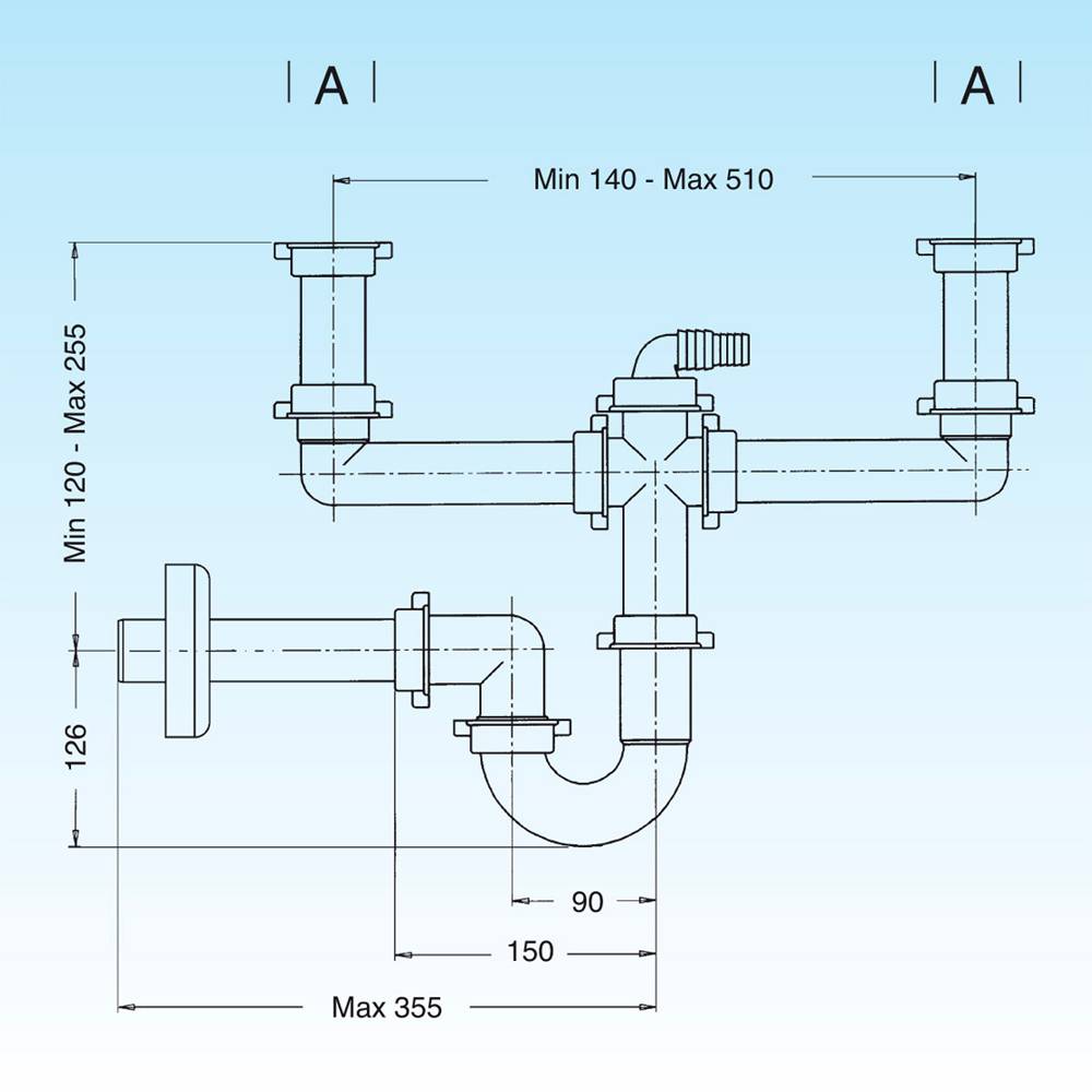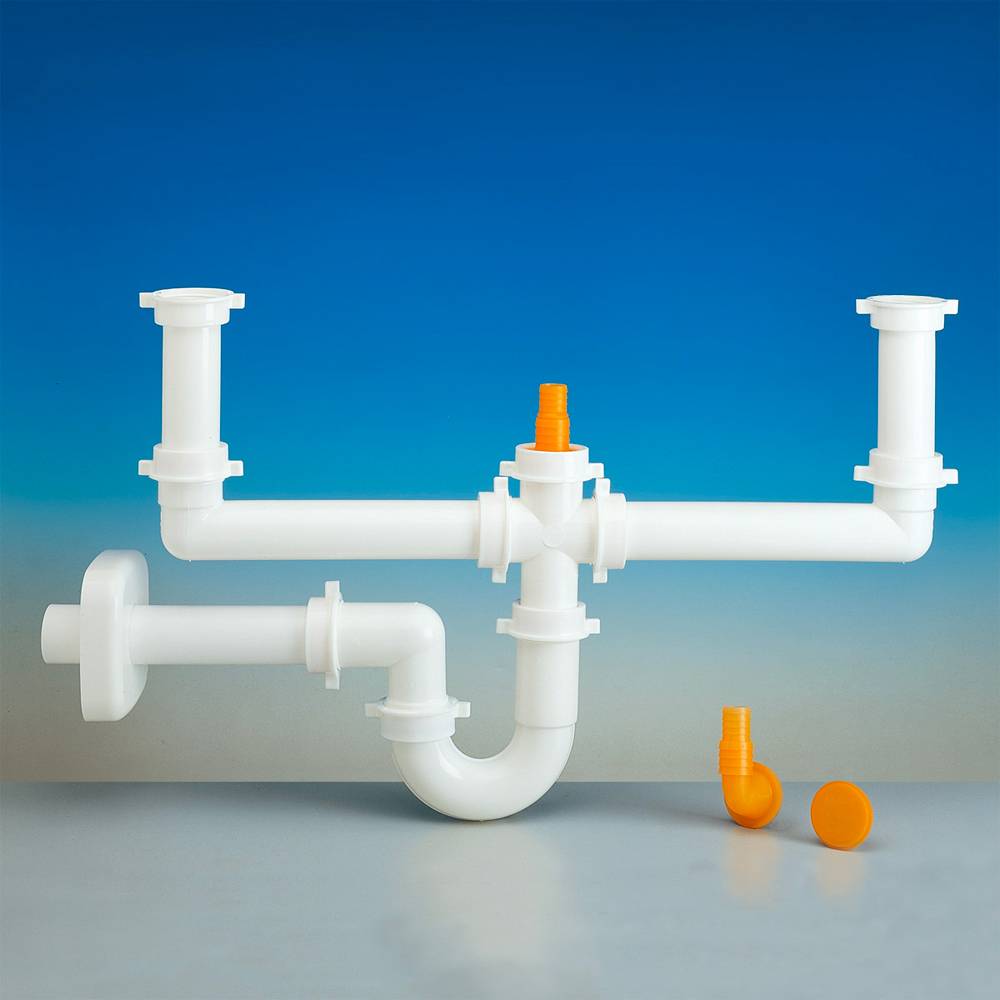 Sifoni a "TUBO" per lavelli a due vasche, senza pilette e completi di raccordi. Con attacco scarico lavastoviglie Ø20-25 verticale.