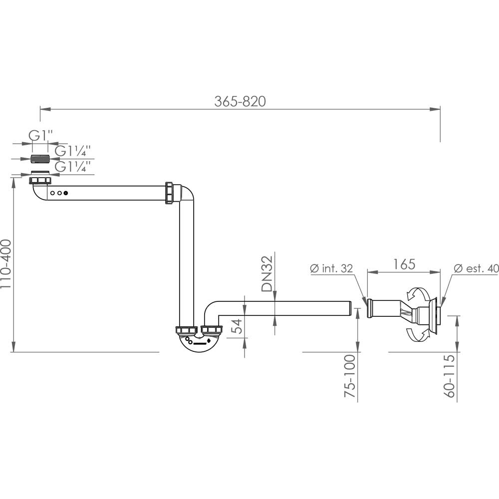 Entrata G1" e G1"1/4. Uscita sifone Ø32 mm. Uscita eccentrico Ø40 mm. Fornito in sacchetto
