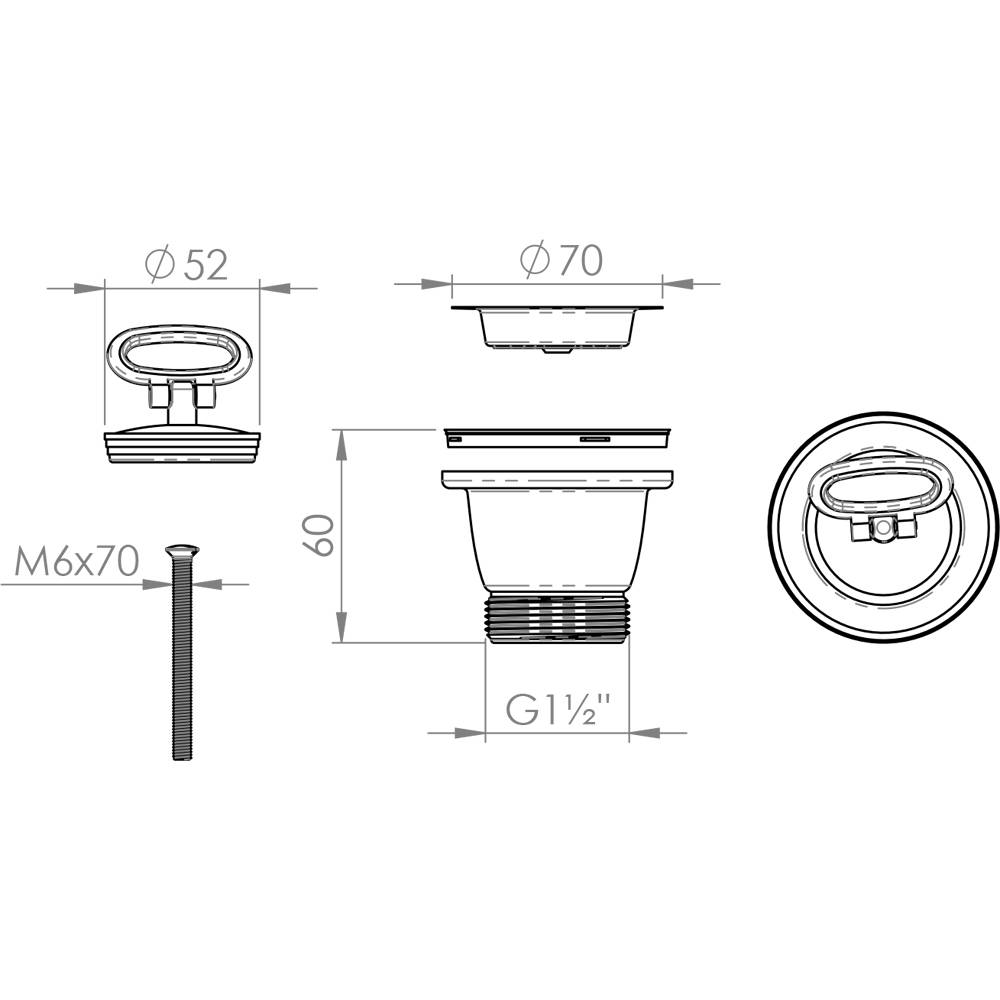 Piletta per lavelli cucina Inox, Sintetici e Ceramica. Con tappo a maniglia Ø52 mm. Foro Ø70 mm. UNI EN ISO 228 - UNI EN 274 - UNI ISO 22768-mK