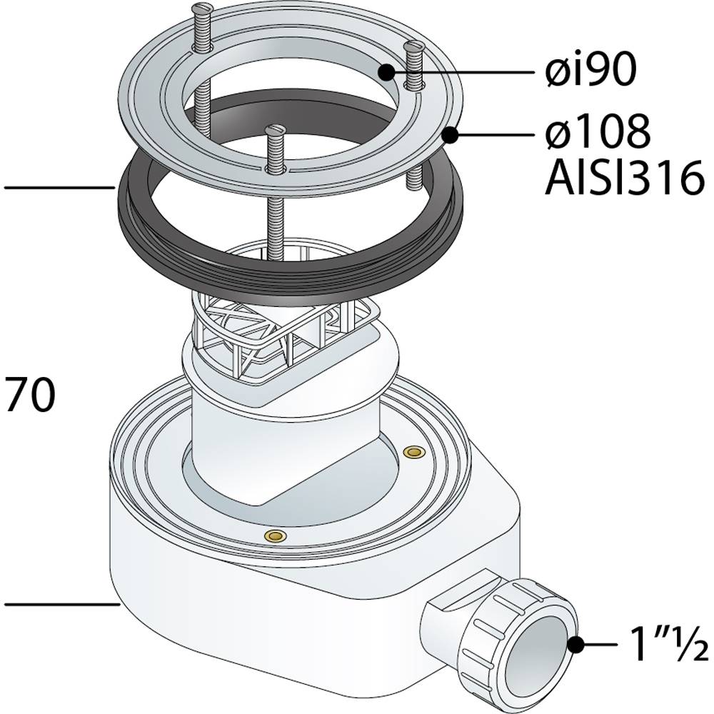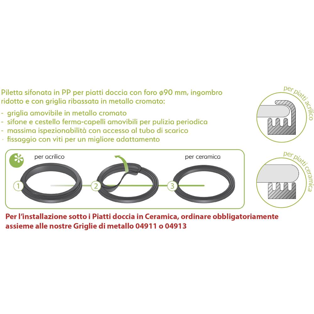 Sifoide per piatti doccia con foro Ø90 mm. Piletta Ø108 mm in Acciaio Inox AISI 316. Guarnzione doppio labbro per piatti doccia in Acrilico, con labbro facilmente rimovibile che la rende piana e installabile per i piatti Doccia in Ceramica. Per l'installazione sotto i piatti doccia in Ceramica, abbinare la piletta ad una delle nostre griglie di metallo codici: 04911 o 04913.
