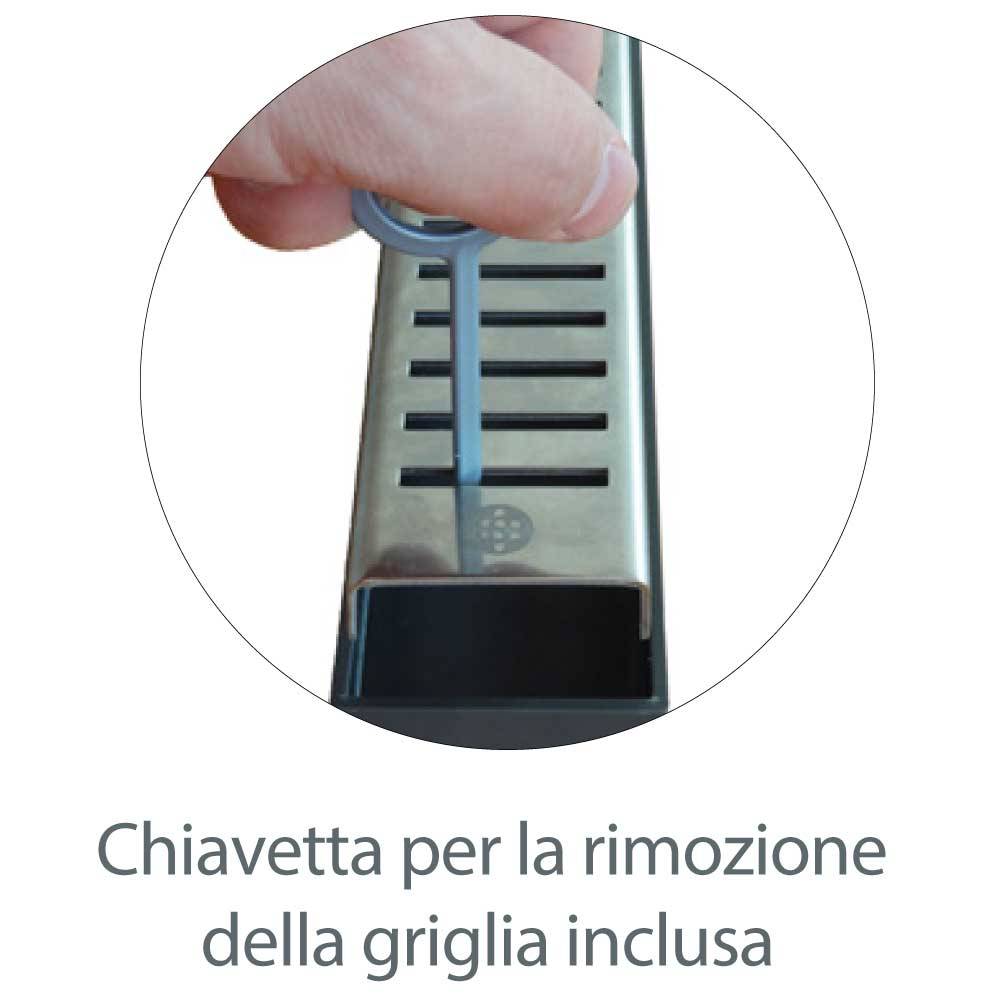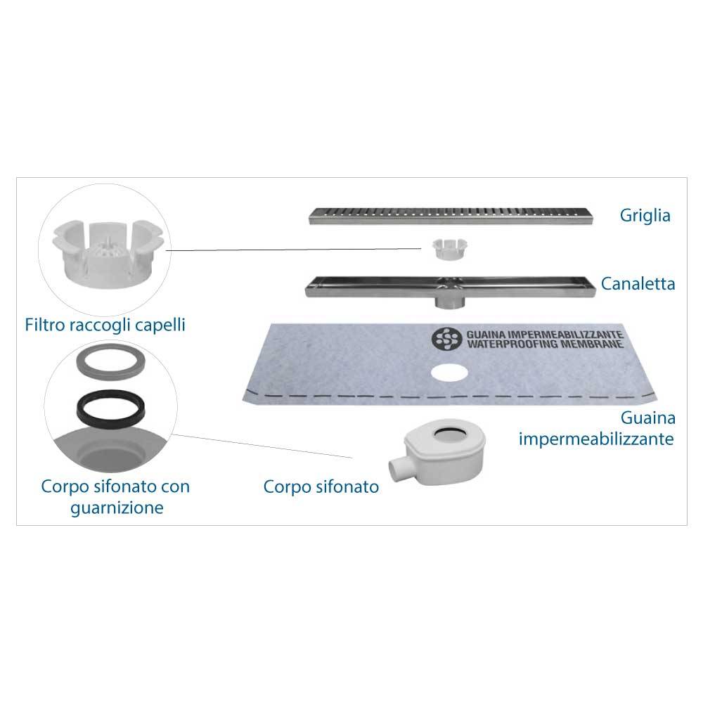 Materiale: - Corpo sifonato, adattatore e filtro in ABS; - Canaletta e griglia in acciaio INOX AISI 304; - Guaina impermeabilizzante composta da due strati esterni di polipropilene + uno strato interno di polietilene. Rappresenta la soluzione ideale per la realizzazione di raffinati bagni con scarico a filo pavimento. L'alta qualità dei materiali utilizzati permette una straordinaria resistenza nel tempo. Il kit comprende il corpo sifonato, il foglio di guaina impermeabilizzante, la canaletta, il filtro e la griglia.