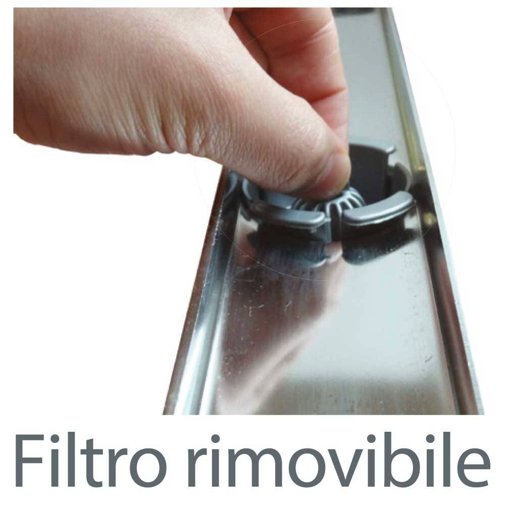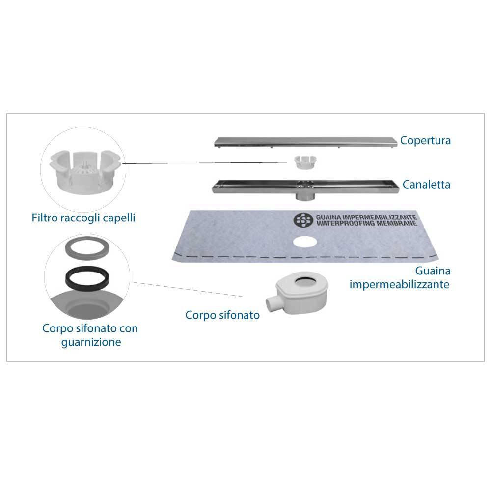 Materiale: - Corpo sifonato, adattatore e filtro in ABS; - Canaletta e copertura in acciaio INOX AISI 304; - Guaina impermeabilizzante composta da due strati esterni di polipropilene + uno strato interno di polietilene. Rappresenta la soluzione ideale per la realizzazione di raffinati bagni con scarico a filo pavimento. L'alta qualità dei materiali utilizzati permette una straordinaria resistenza nel tempo. Il kit comprende il corpo sifonato, il foglio di guaina impermeabilizzante con adattatore incorporato, la canaletta, il filtro e la copertura.