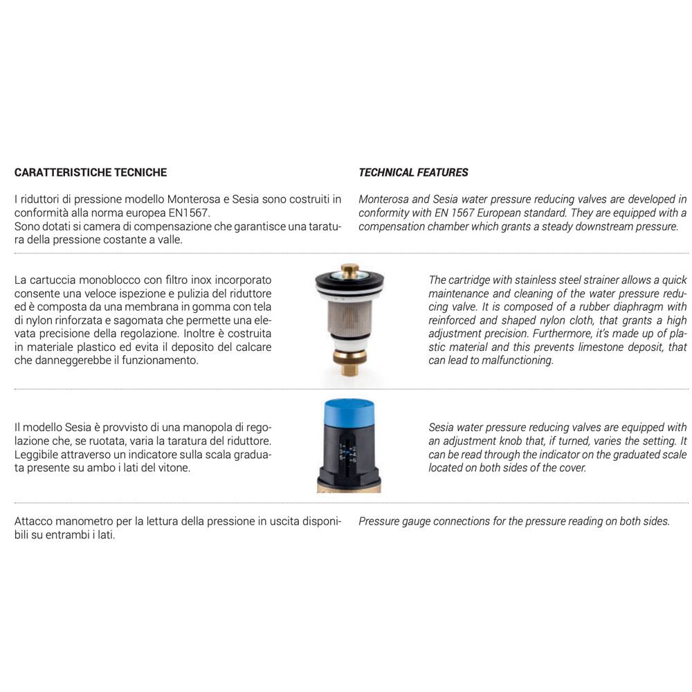I riduttori di pressione modello Sesia sono dispositivi regolabili in grado di ridurre e mantenere la pressione a valle impostata, anche al variare della pressione a monte. Sono tutti forniti con taratura standard a 3 bar. Questi riduttori sono costruiti con una cartuccia monoblocco, per una facile sostituzione o manutenzione in caso di necessità e possono essere installati su impianti con pressioni di esercizio fino ad un massimo di 20 bar.