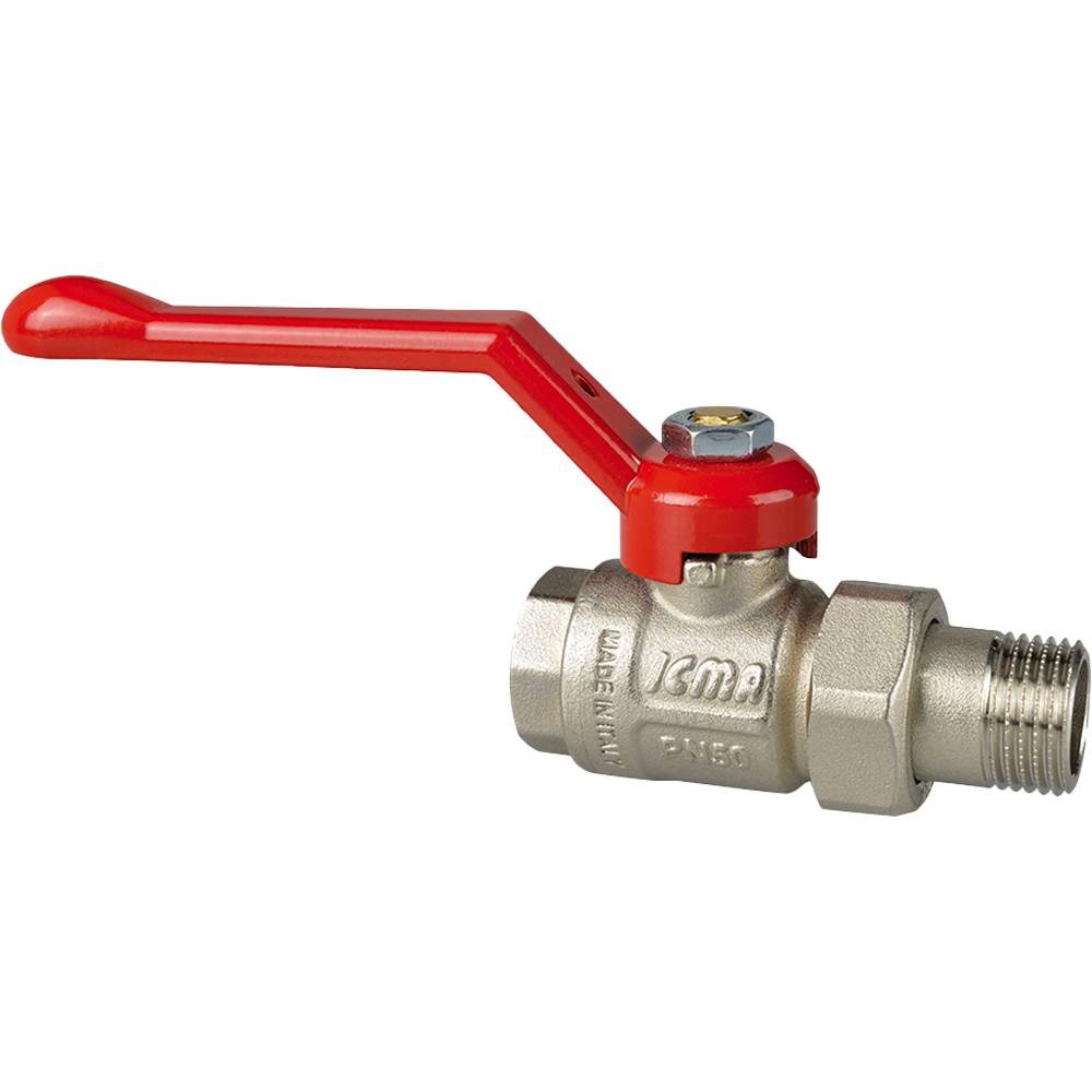 Valvola a sfera a passaggio totale con bocchettone. Leva in alluminio verniciato rosso. Filettatura M/F. Asta comando antiscoppio doppio O-Ring. Idonea per acqua in impianti di riscaldamento/raffrescamento. Filettatura ISO 228