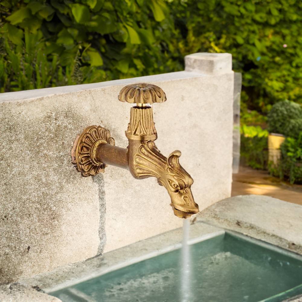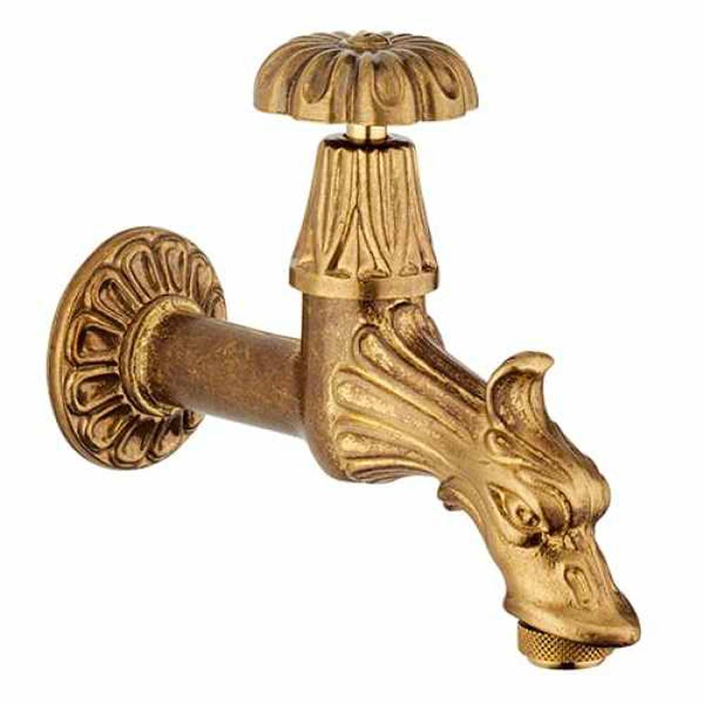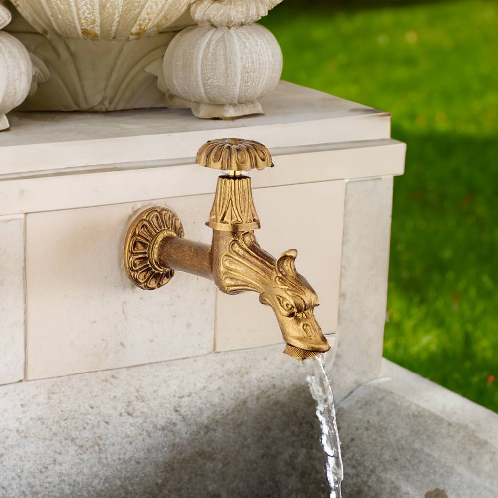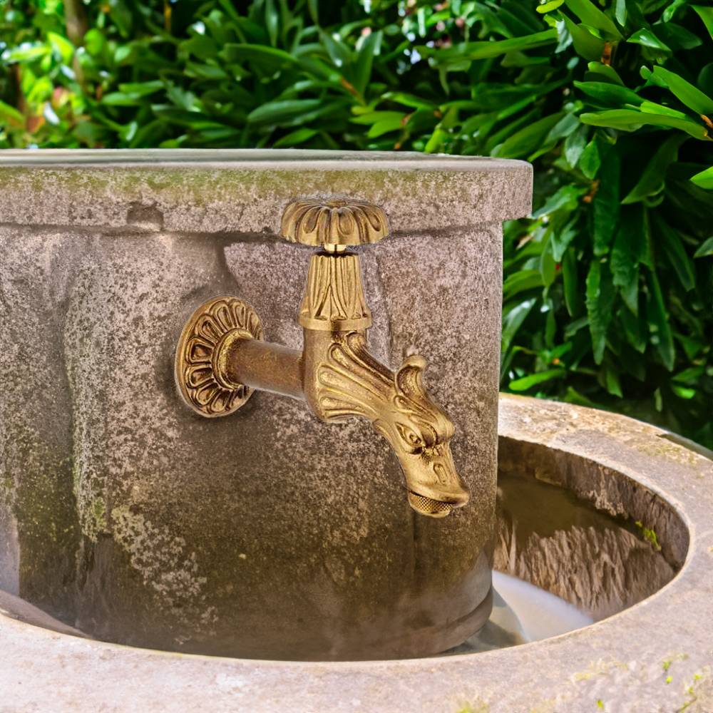 Rubinetto artistico fornito competo di - Riduzione per attacco portagomma; - Rompigetto; - Rosone. Per fontana da giardino.