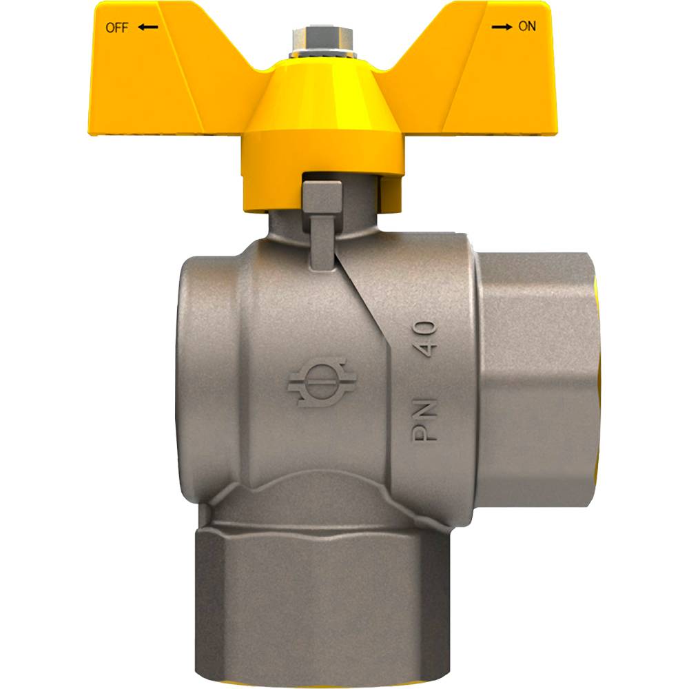 Serie: FUTURGAS GP 2235. Valvola a sfera a squadra per gas, con Farfalla in alluminio verniciata gialla. Filettatura: UNI EN ISO 10226-1 (ISO 7-1:1994). Pressione di esercizio: MOP 5. Classe di resistenza alle alte temperature: B0,1. Temperatura di esercizio: da -20 °C a +60 °C