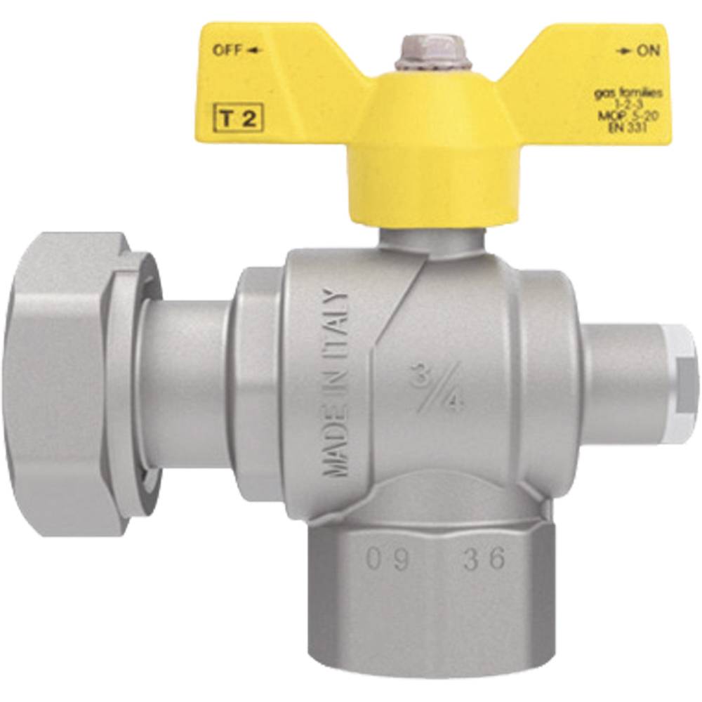 Serie: FUTURGAS GP 2235 Valvola a sfera a squadra per gas nichelata, attacco Femmina-Dado girevole Femmina, con attacco di pressione, con maniglia a Farfalla in alluminio verniciata gialla. - Filettatura Femmina: UNI EN ISO 10226-1 (ISO 7-1:1994) - Filettatura dado girevole e presa di pressione: UNI EN ISO 228-1 - Pressione di esercizio: MOP 5 - Classe di resistenza alle alte temperature: B0,1 - Temperatura di esercizio: da -20 °C a +60 °C. Le valvole devono essere utilizzate solo in posizione completamente aperta o chiusa.