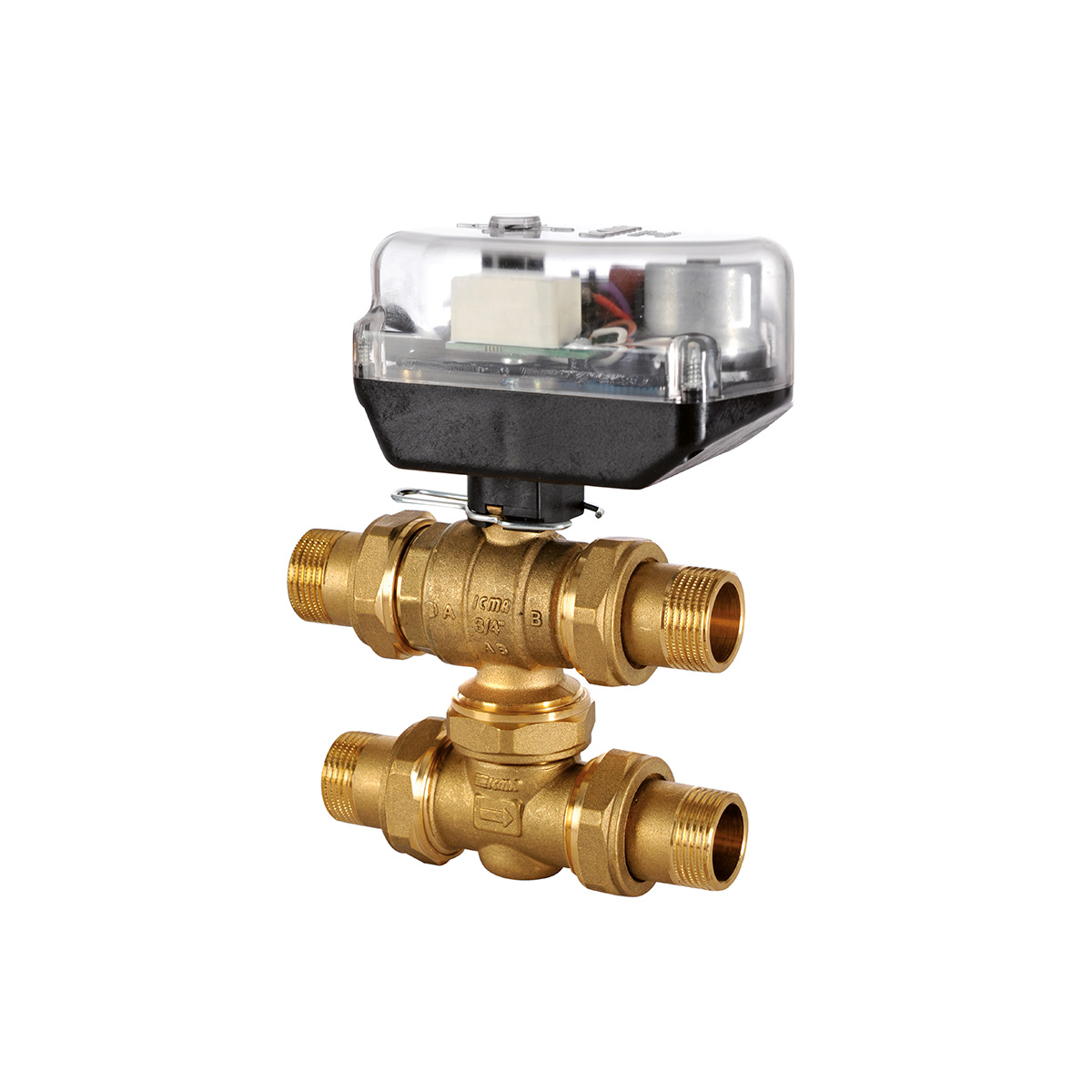 Valvola di zona a sfera a passaggio totale a quattro vie motorizzata con servocomando con relè e micro ausiliario per contatto pulito. Connessioni a bocchettone, interasse fisso 50 mm. Pressione max.d'esercizio 16 bar. Pressione differenziale max. 10 bar. Temperatura d'esercizio max. 110°C.