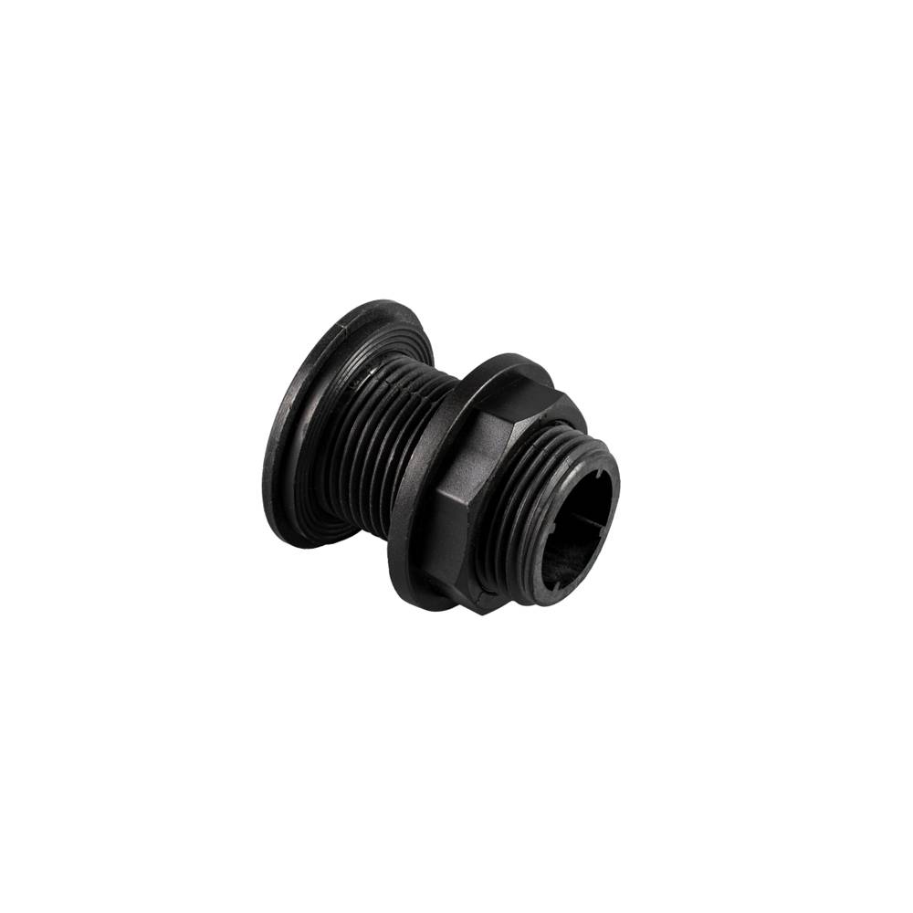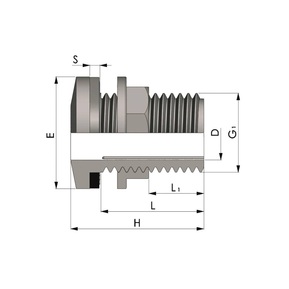 Una estremità maschio filettata ed una munita di collare di serraggio e guanzione Piana in EPDM. Guarnzione spessa per compensare le ondulazioni della parete del contenitore. Pressione di esercizio: 10 bar a 20°C. Standard di connessione: Filettatura esterna GAS cilindrico UNI ISO 228/1. Temperatura massima di esercizio: 80°C. Materiali: Polipropilene (PP) EPDM Colori: Nero (RAL 9011)