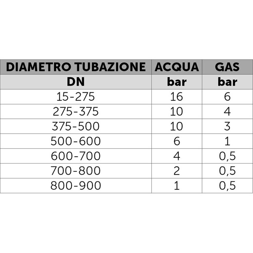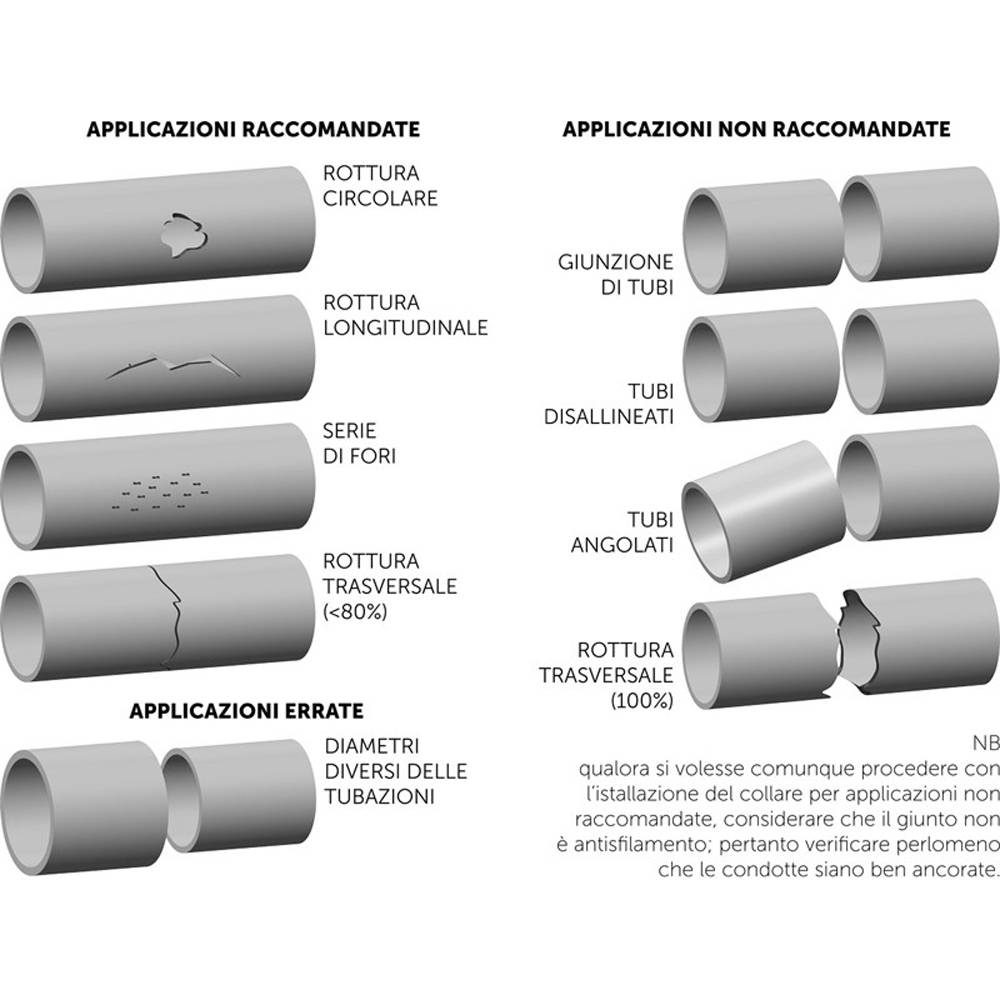 Collare a manicotto a tre tiranti per la riparazione temporanea di tutti i tipi ditubazioni ad impiego acqua o gas. Compatibile con acqua potabile, si utilizza per molteplici tipologie di rotture anche trasversali fino all'80% purchè le tubazioni siano ben ancorate visto che il collare non funge da giunto antisfilamento. Riparazione di condotte rigide come acciaio, ghisa, fibrocemento e PVC. Certificato all'utilizzo su impianti per acqua potabile secondo il D.M. 174 del 2004, Collaudato con prove a pressione in laboratorio. Applicazione su tutte le superfici, anche rugose. Non esporre ad irradiazione solare (per conservazione della guarnizione). Temperatura di utilizzo -10°C / 60°C. PN16. MOP 6 bar.
