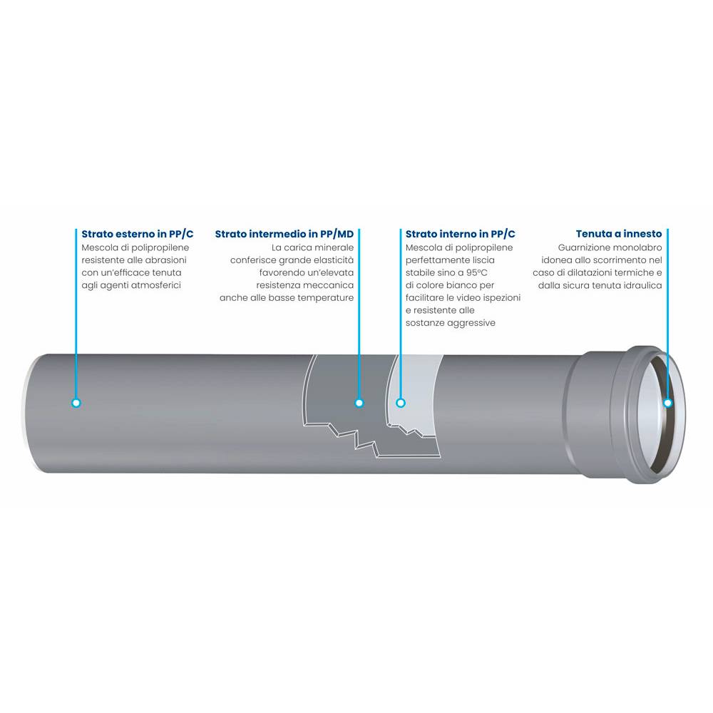 Vendibile solo a confezione. Tubo dotato di bicchiere d'innesto con guarnizione elastomerica monolabbro preinstallata (DIN EN 681 e DIN 4060). Tubi in PP-H/MD/PP-H. I materiali che compongono il sistema BAMPLAST PP-TECH sono completamente riciclabili e realizzati in assenza di alogeni, cadmio e metalli pesanti. La temperatura del fluido evacuato all'interno del sistema può raggiungere per un breve periodo di tempo i 98°C, mentre per il lungo periodo la temperatura può raggiungere i 95°C Rigidità anulare pari a 4,0 kN/m² (SN4 secondo EN 1401). Coefficiente di dilatazione lineare pari a 0,11 mm/mk. Resistenza al fuoco in Classe D-s2, d2 (in accordo alla EN 13501-1). Realizzato mediante una struttura a 3 strati con parete esterna prodotta in PP-C (polipropilene copolimero colore grigio RAL 7037), strato intermedio (colore grigio scuro) in PP-TV (polipropilene rinforzato con minerali), parete interna in PP-C (polipropilene copolimero colore bianco RAL 9003).