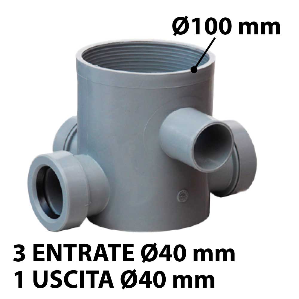 | 0655002 | POZZETTO WC BASSO H.120 A INNESTO Ø100 IN PP GRIGIO 3 Entrate Ø40 - 1 Uscita Ø40