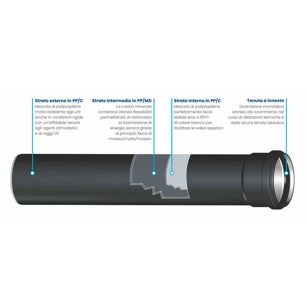 Tubi in PP-C/MD/PP-C e raccordi in PP-C/MD. I materiali che compongono il sistema Sistema insonorizzato per lo scarico dei reflui conforme alla EN 1451-1 in Classe BD (all'interno del fabbricato e all'esterno entro 1 metro dal perimetro del fabbricato) idoneo per impianti in edifici a destinazione residenziale, industriale e commerciale, pubblici e ricettivi come ospedali, case di riposo e RSA, alberghi, scuole, luoghi di culto. Il sistema ULTRA SILENT è altresì idoneo per la realizzazione di impianti di ventilazione e areazione, estrazione, aspirazione polveri.