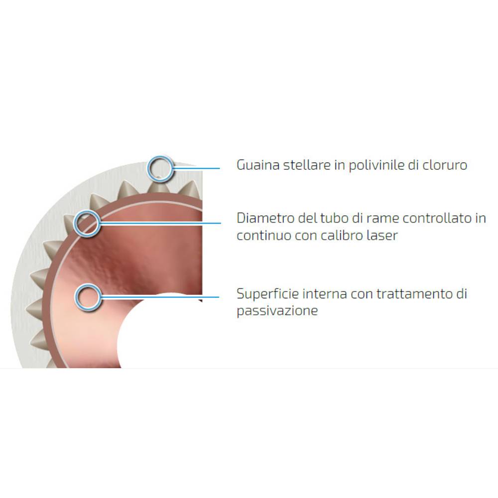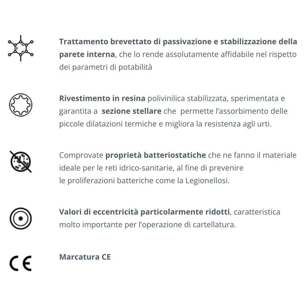 Campi di Utilizzo: - Acqua potabile fredda; - Distribuzione di combustibili liquidi e gassosi. Prodotto secondo la norma EN 1057. Conforme al D.M. 174, e presenta comprovate proprietà batteriostatiche che lo rendono idoneo per le reti irico-sanitarie. L'assolutà impermeabilità ai gas ne consente anche l'impiego per il trasporto di combustibili liquidi e gassosi. Marchio CE.