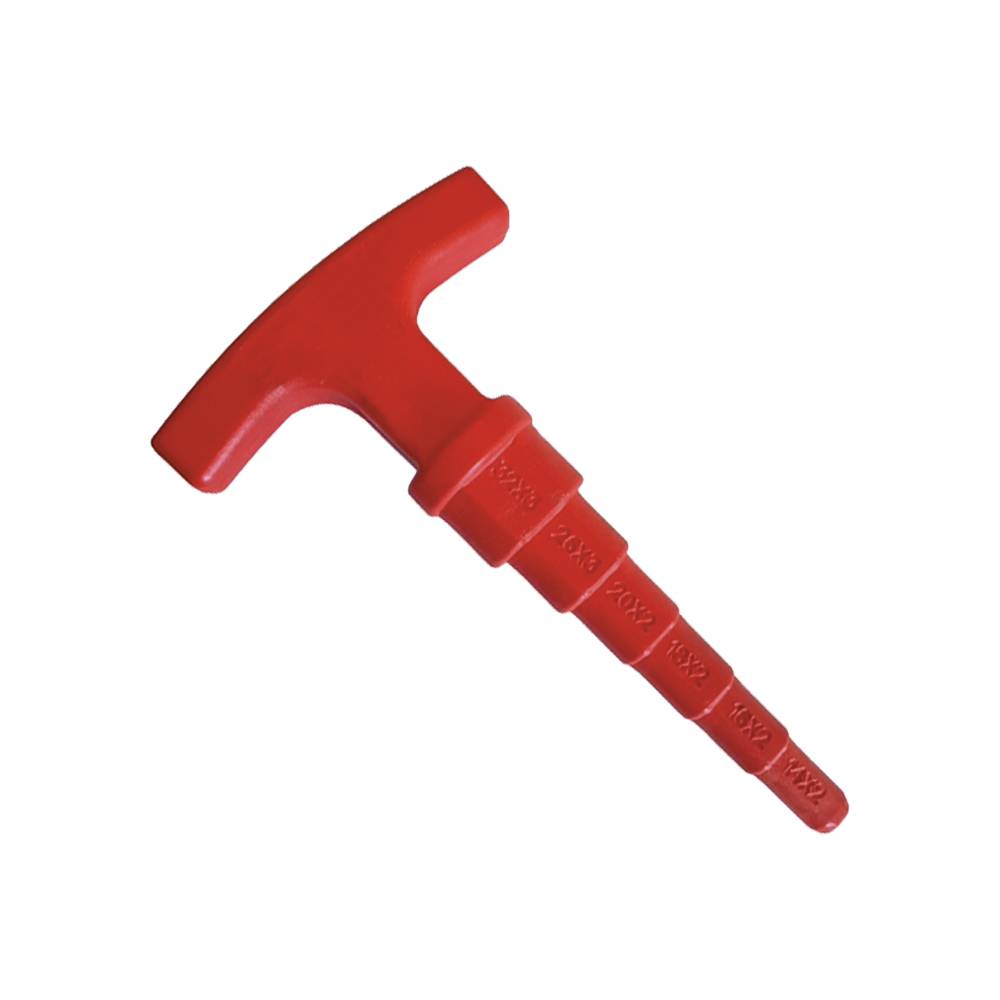 Semplice calibratore multimisura Ø14-16-18-20 x (2) mm / 26-32 x (3) mm. Sfaccettato in materiale plastico duro. Per riportare a misura le estremità di tubi in multistrato deformati dopo il taglio.