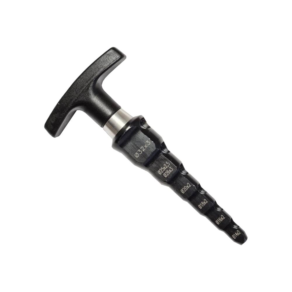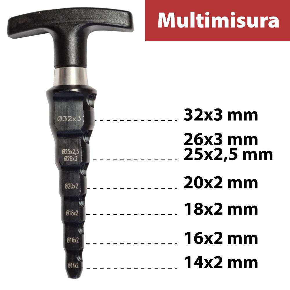 Ø14-16-18-20 x (2) mm / 25 x 2,5 mm / 26-32 x (3) mm. Corpo a sezione cilindrica in Acciaio speciale brunito. 2 Taglienti per misura. Per sbavare la parte interna del tubo multistrato e 6 misure per ricalibrare il diametro interno dopo il taglio.